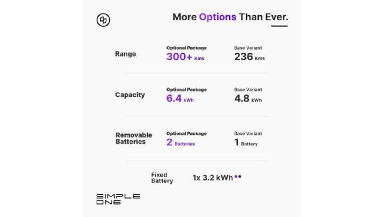 இரண்டு பேட்டரிகள் கொண்ட சிம்பில் ஒன் ஸ்கூட்டர் விலை ரூ. 1.45 லட்சம், எக்ஸ்-ஷோரூம் என நிர்ணயம் செய்யப்பட்டு உள்ளது. புதிய ஆப்ஷன் இந்த பிரிவு வாகனங்களில் அதிக ரேன்ஜ் வழங்கும் மாடலாக அமைந்துள்ளது. இந்த ஸ்கூட்டர் மணிக்கு 0 முதல் 40 கிலோமீட்டர் வேகத்தை 2.85 நொடிகளில் எட்டிவிடும். மேலும் அதிகபட்சமாக மணிக்கு 105 கிலோமீட்டர் வேகத்தில் செல்லும் திறன் கொண்டுள்ளது.