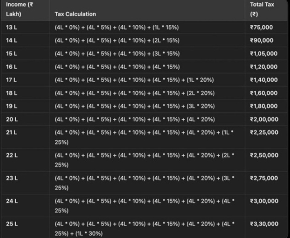 ரூ. 12 லட்சத்துக்கு மேல் ரூ.16 லட்சம் வரை 15% வருமான வரி செலுத்த வேண்டியிருக்கும். இதேபோல, ரூ.16 லட்சத்துக்கு மேல் ரூ.20 லட்சம் வரை வருமானம் ஈட்டினால் 20%, ரூ.20 லட்சத்துக்கு மேல் ரூ.24 லட்சம் வரை வருமானம் சம்பாதித்தால் 25% வருமான வரி செலுத்த வேண்டும். அதிகபட்சமாக ரூ.24 லட்சத்துக்கு மேல் ஆண்டு வருமானம் ஈட்டும் தனிநபர்கள் 30% வரி செலுத்த வேண்டும்.