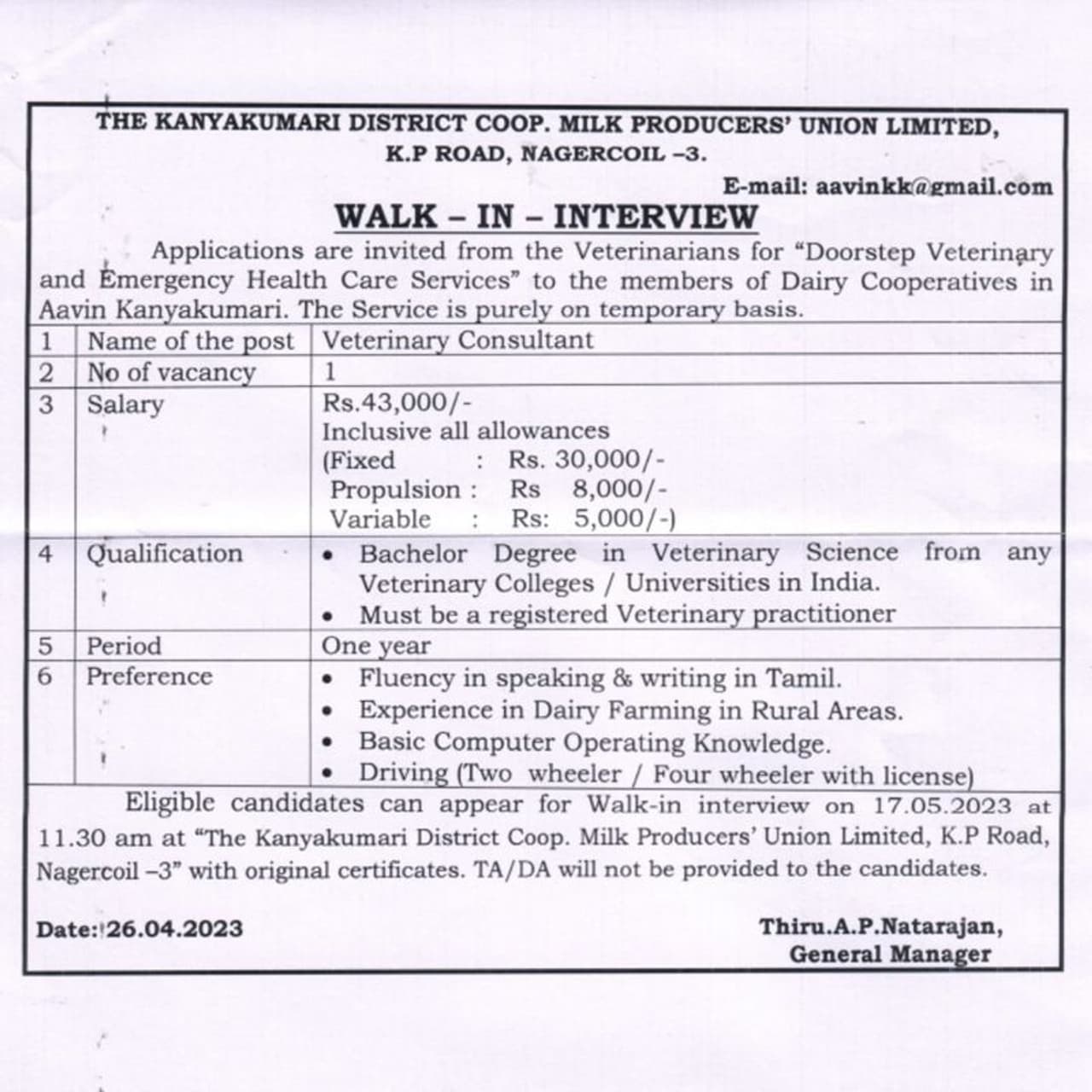 ஆவின் கன்னியாகுமரி கால்நடை ஆலோசகர் பதவிக்கான தேர்வு நேர்காணல் அடிப்படையில் நடத்தப்படுகிறது.