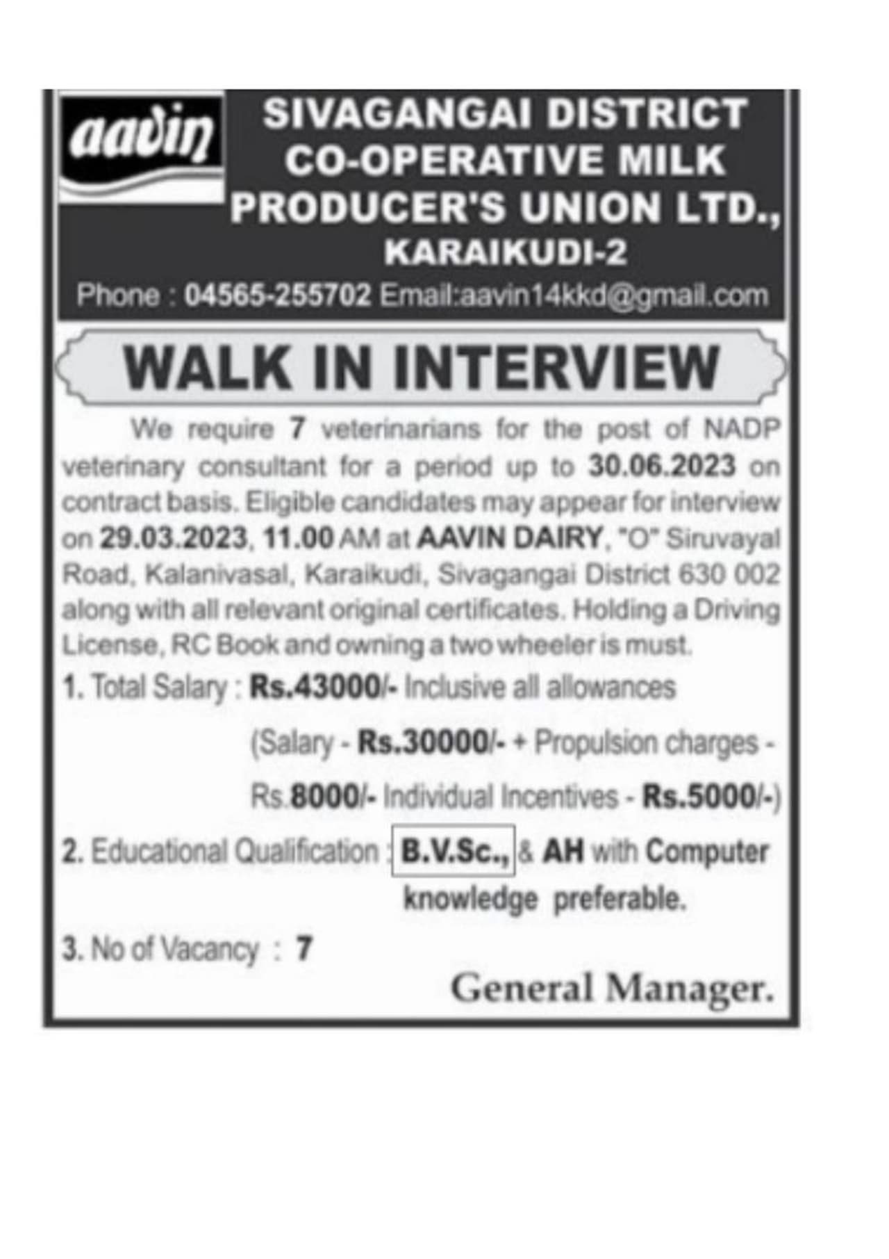 சிவகங்கை கூட்டுறவு பால் உற்பத்தியாளர்கள் யூனியன் லிமிடெட் சிவகங்கை கூட்டுறவு பால் உற்பத்தியாளர்கள் யூனியன் லிமிடெட், ஆவின் புதிய வேலைவாய்ப்பு அறிவிப்பை வெளியிட்டுள்ளது. கால்நடை ஆலோசகர் காலியிடங்களை நிரப்புவதற்கான விண்ணப்பங்கள் வரவேற்கப்படுகின்றன என்று தெரிவித்துள்ளது.