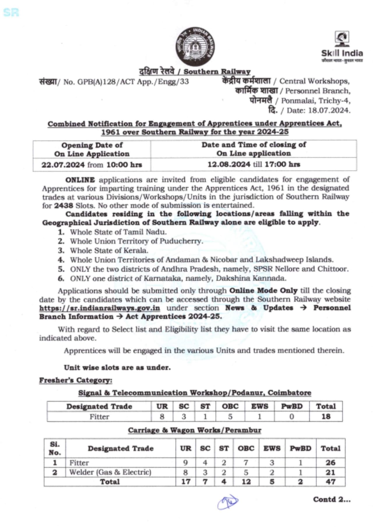சிக்னல் & தொலைத்தொடர்பு பட்டறை / போதனூர், கோயம்புத்தூர்- ஃப்ரெஷர்- 18வண்டி மற்றும் வேகன் ஒர்க்ஸ் பெரம்பூர்- ஃப்ரெஷர் 47ரயில்வே மருத்துவமனை / பெரம்பூர் மெடிக்கல் - லேபரேட்டரி டெக்னீசியன் எம்எல்டி - ஃப்ரெஷர் - 20 சிக்னல் & டெலிகம்யூனிகேஷன் பட்டறை / போடனூர், கோயம்புத்தூர் - எக்ஸ்-ஐடிஐஐ-5-Ex-ITII- 5 145சேலம் பிரிவு முன்னாள் ஐடிஐ 222பாலக்காடு பிரிவு முன்னாள் ஐடிஐ 285 வண்டி மற்றும் வேகன் ஒர்க்ஸ் / பெரம்பூர்- எக்ஸ்-ஐடிஐ - 350எலக்ட்ரிகல் ஒர்க்ஷாப் / பெரம்பூர்- முன்னாள் ஐடிஐ-130லோகோ ஒர்க்ஸ் பெரம்பூர்- முன்னாள் ஐடிஐ - 228இன்ஜினியரிங் ஒர்க்ஷாப் - 228இன்ஜினியரிங் ஒர்க்ஷாப் / அரிகோணம் 4 பணியாளர் கிளை- முன்னாள் ஐடிஐ - 24சென்னை பிரிவு மின் / ரோலிங் ஸ்டாக் / அரக்கோணம் - முன்னாள் ஐடிஐ - 65 சென்னை பிரிவு மின் / ரோலிங் ஸ்டாக் / ஆவடி- முன்னாள் ஐடிஐ- 65சென்னை பிரிவு எலக்ட்ரிக்கல் / ரோலிங் ஸ்டாக் / தாம்பரம் - முன்னாள் ஐடிஐ - 55 ரோலிங் ஸ்டாக் / ராயபுரம்- முன்னாள் ஐடிஐ - 30சென்னை பிரிவு மெக்கானிக்கல் டீசல்- எக்ஸ்-ஐடிஐ- 22சென்னை பிரிவு மெக்கானிக்கல் கேரேஜ் & வேகன்- எக்ஸ்-ஐடிஐ - 250சென்னை டிவிஷன் ரயில்வே மருத்துவமனை பெரம்பூர்- முன்னாள் ஐடிஐ - 3சென்ட்ரல் ஒர்க்ஷாப்கள் பொன்மலை- முன்னாள் ஐடிஐ- திருச்சிராப்பள்ளி 201 முன்னாள் ஐடிஐ - 94மதுரை பிரிவு- முன்னாள் ஐடிஐ - 84.