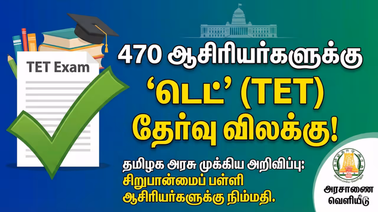 Teachers அரசு உதவி பெறும் சிறுபான்மைப் பள்ளிகளில் பணிபுரியும் 470 ஆசிரியர்களுக்கு டெட் (TET) தேர்வில் இருந்து விலக்கு அளித்து தமிழக அரசு உத்தரவிட்டுள்ளது.