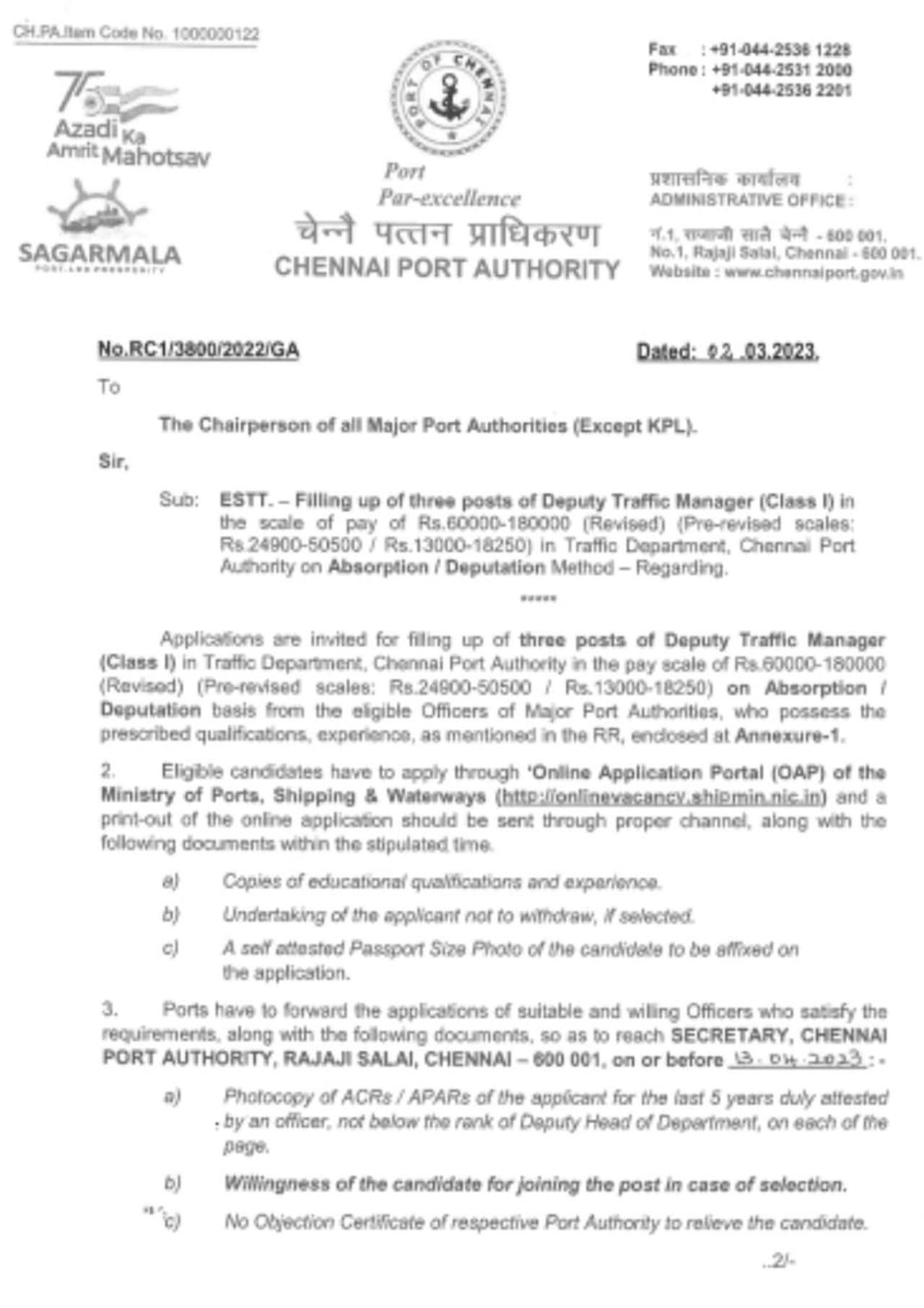 சென்னை துறைமுகத்தில் (சென்னை போர்ட் டிரஸ்ட்), தங்கள் நிறுவனத்தில் 04 வேலை காலியிடங்களை அறிவித்துள்ளது. சென்னை போர்ட் டிரஸ்ட் அமைப்பில் சேர இது ஒரு சிறந்த வாய்ப்பு ஆகும். எனவே, இந்த அறிவிப்புக்கு ஆர்வமும் தகுதியும் உள்ளவர்கள் 02.03.2023 முதல் 13.04.2023 வரை ஆன்லைனில் விண்ணப்பிக்கலாம்.