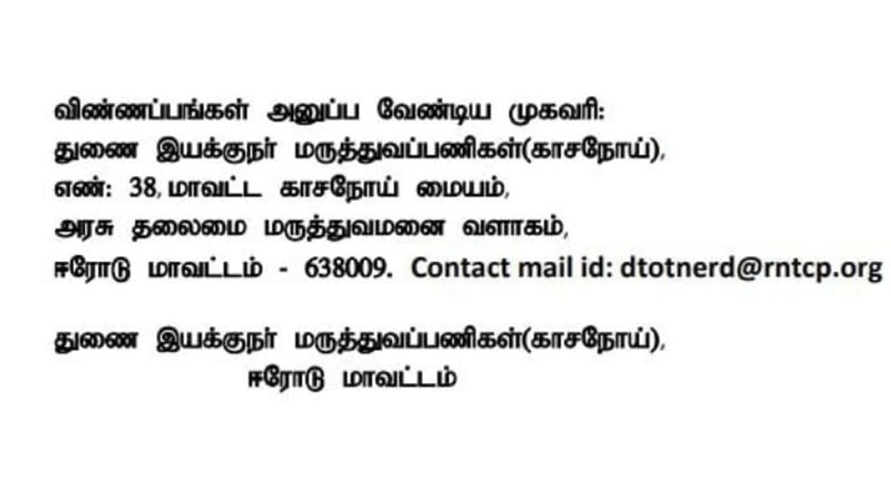 மூத்த காசநோய் ஆய்வக மேற்பார்வையாளர் - டிப்ளமோ, பட்டப்படிப்பு, லேப் டெக்னீசியன் / ஸ்பூட்டம் மைக்ரோஸ்கோபிஸ்ட் - 12வது, டிப்ளமோ, மாவட்ட பொது சுகாதார வேலைக்கு டிப்ளமோ, பட்டப்படிப்பு, காசநோய் சுகாதார பார்வையாளர் - 12வது, பட்டப்படிப்பு, MPW/ LHV/ ANM, வணிகவியலில் கணக்காளர் - பட்டப்படிப்பு, டேட்டா என்ட்ரி ஆபரேட்டர் - 12வது, டிப்ளமோ, டிரைவர் - 10வது படித்திருக்க வேண்டும் என்றும் தெரிவிக்கப்பட்டுள்ளது.