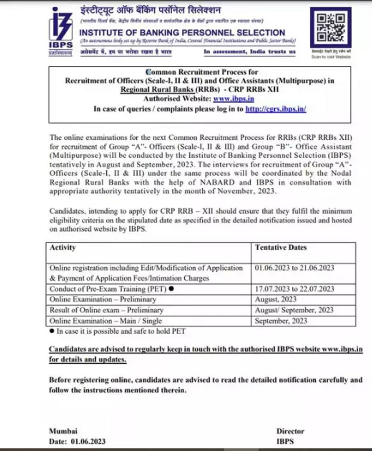 இந்த தேர்வுகள் ஆகஸ்ட் மற்றும் செப்டம்பர் ஆகிய மாதங்களில் இருக்கலாம். குரூப் ஏ- அதிகாரிகள் (ஸ்கேல்-I, II & III) ஆட்சேர்ப்புக்கான நேர்காணல்கள், அதே செயல்பாட்டின் கீழ் NABARD மற்றும் IBPS உதவியுடன் நோடல் பிராந்திய கிராமப்புற வங்கிகளால் ஒருங்கிணைக்கப்படும். நவம்பர், 2023-ல் தற்காலிகமாக உரிய அதிகாரிகளுடன் கலந்தாலோசிக்க வேண்டும் என IBPS அறிவிப்பு கூறுகிறது.