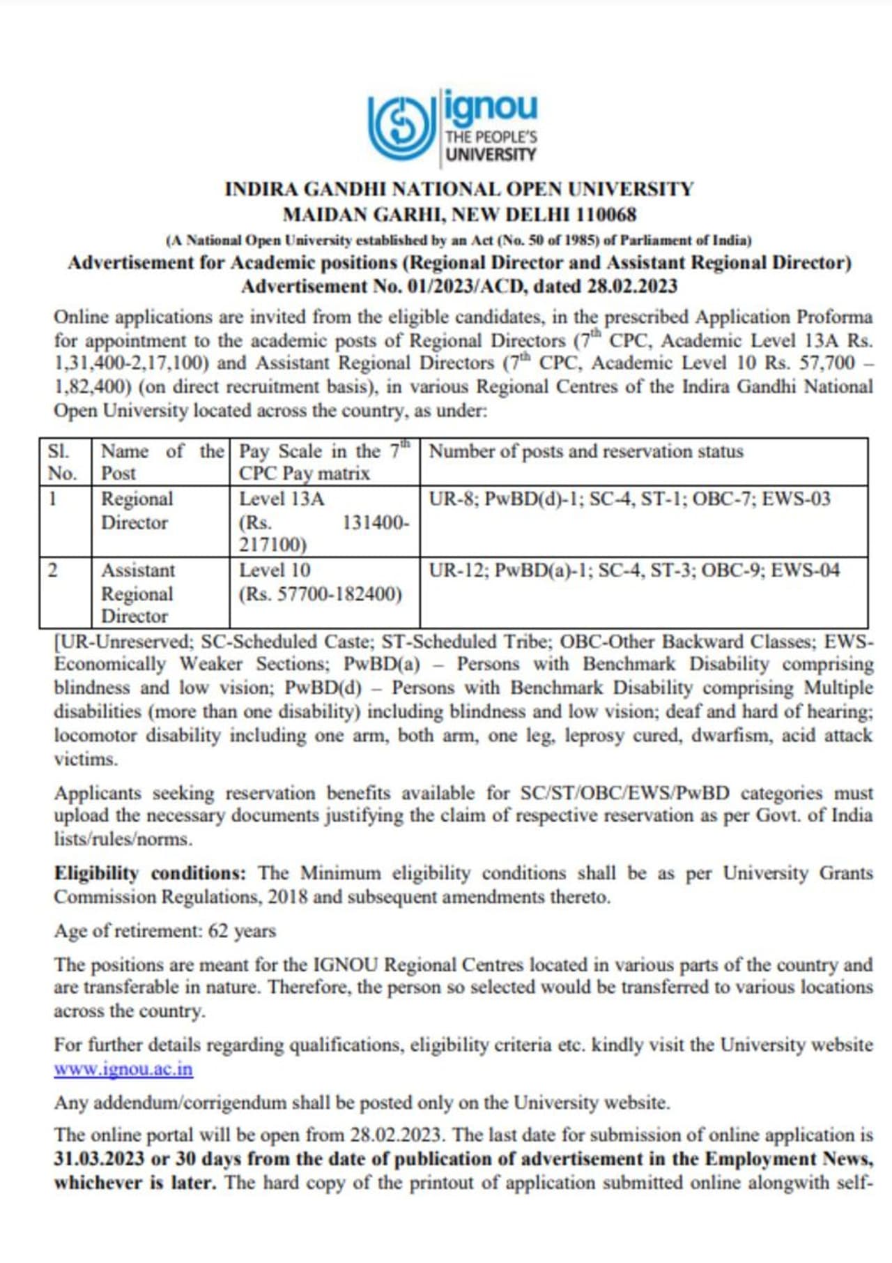 இந்த வேலை அறிவிப்புக்கு ஆர்வமும் தகுதியும் உள்ளவர்கள் 28.02.2023 முதல் 31.03.2023 வரை ஆன்லைனில் விண்ணப்பிக்கலாம் என்று தெரிவிக்கப்பட்டுள்ளது. எனவே, IGNOU வேலை காலியிடங்கள், வயது வரம்பு, விண்ணப்பக் கட்டணம், சம்பள விவரங்கள், விண்ணப்பிக்கும் முறை போன்றவற்றை பார்க்கலாம்.