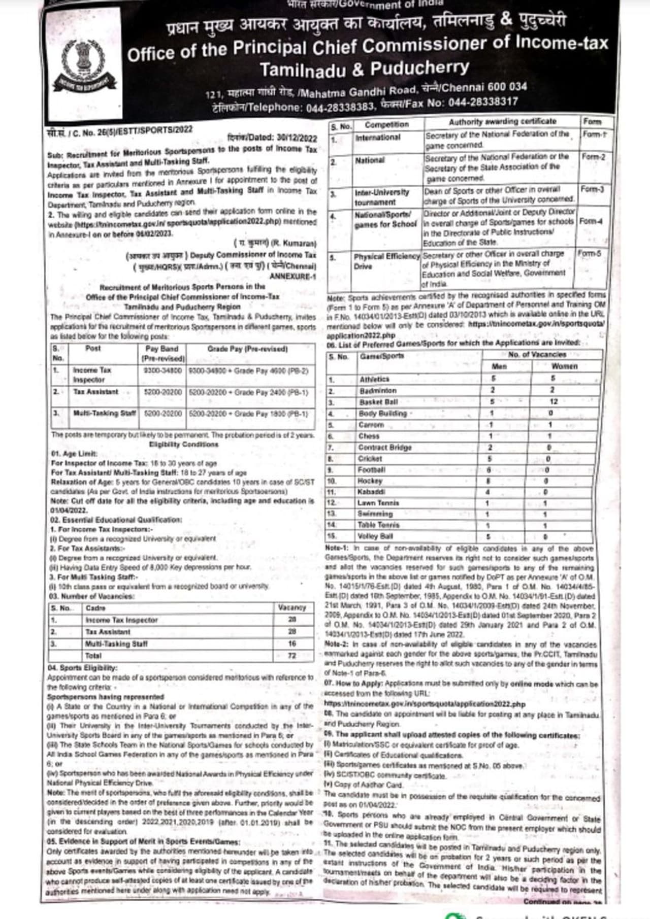 தமிழ்நாடு மற்றும் புதுச்சேரியில் 72 வருமான வரி ஆய்வாளர்கள், வரி உதவியாளர்கள், பல்பணிப் பணியாளர்கள் பணியிடங்களை நியமிக்க வருமான வரித் துறை தமிழ்நாடு முடிவு செய்துள்ளது. விண்ணப்பதாரர்கள் தகுதி, வயது வரம்பு,தேர்வு மற்றும் சம்பள விவரங்கள் பற்றிய விவரங்களை பற்றி இந்த பதிவில் பார்க்கலாம்.