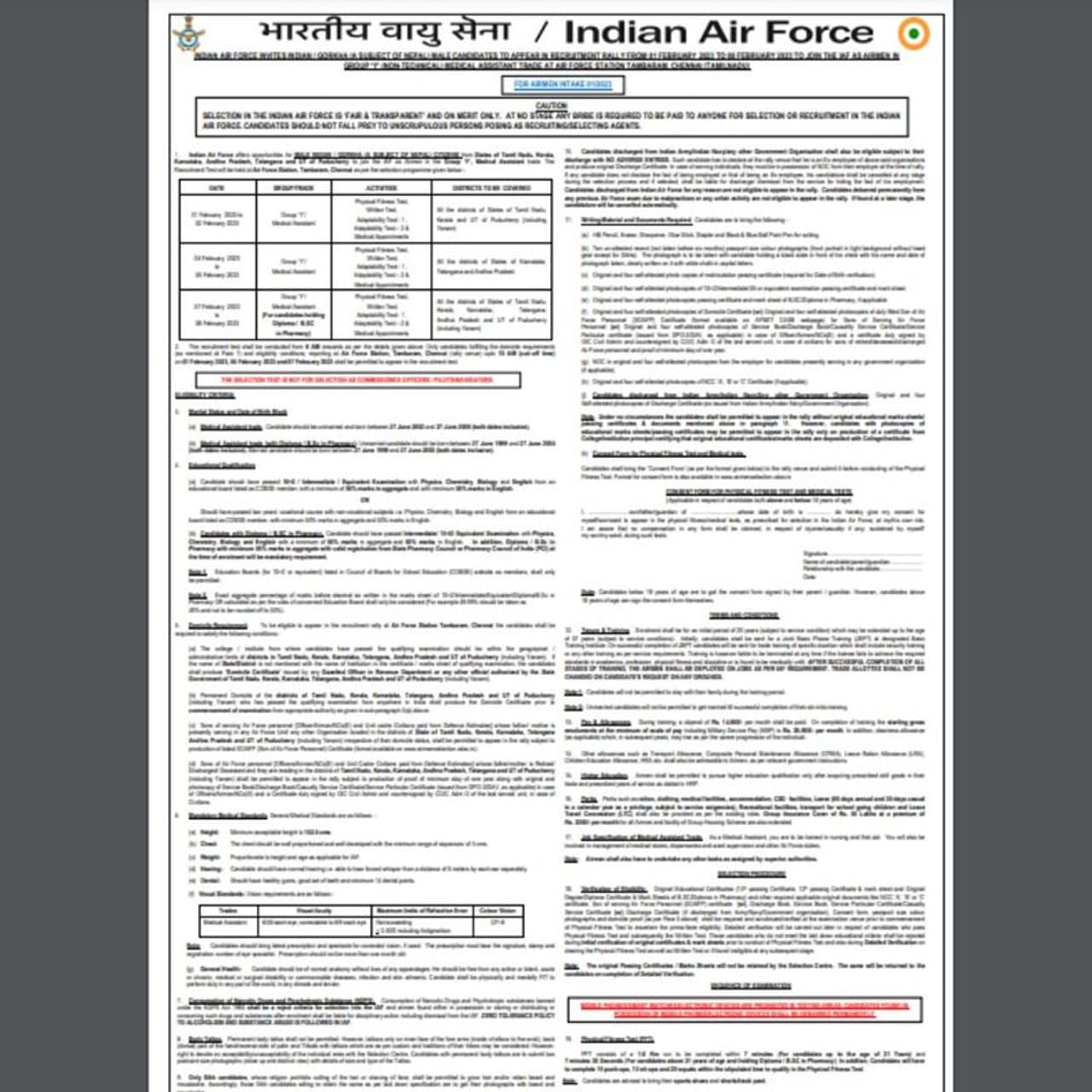 இந்திய விமானப்படை குழு 'Y' ஆண் மருத்துவ உதவியாளர் பிரிவில் சேர இந்திய குடிமக்களை (திருமணமாகாத ஆண் இந்தியன் / நேபாள குடிமக்கள்) குழு Y ஆக (தொழில்நுட்பமற்ற) கிளைகளில் இந்த உயரடுக்கு படையின் ஒரு பகுதியாக இருக்க அழைப்பு விடுத்துள்ளது.