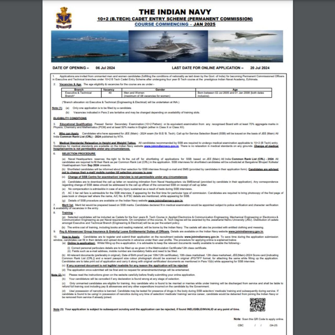 இந்திய கடற்படை அதன் அதிகாரப்பூர்வ இணையதளத்தில் 10+2 (B.Tech) கேடட் நுழைவுத் திட்டம் (நிரந்தர கமிஷன்) அறிவிப்புக்கான விரிவான அறிவிப்பை வெளியிட்டுள்ளது. திருமணமாகாத ஆண்கள் மற்றும் திருமணமாகாத அனைவரும் குறிப்பிட்ட கல்வித் தகுதிகளைக் கொண்ட பெண்கள் இந்தியக் கடற்படையின் கீழ் நிர்வாக மற்றும் தொழில்நுட்பக் கிளைகளில் நிரந்தர ஆணையிடப்பட்ட அதிகாரிகளுக்கு விண்ணப்பிக்கலாம்.