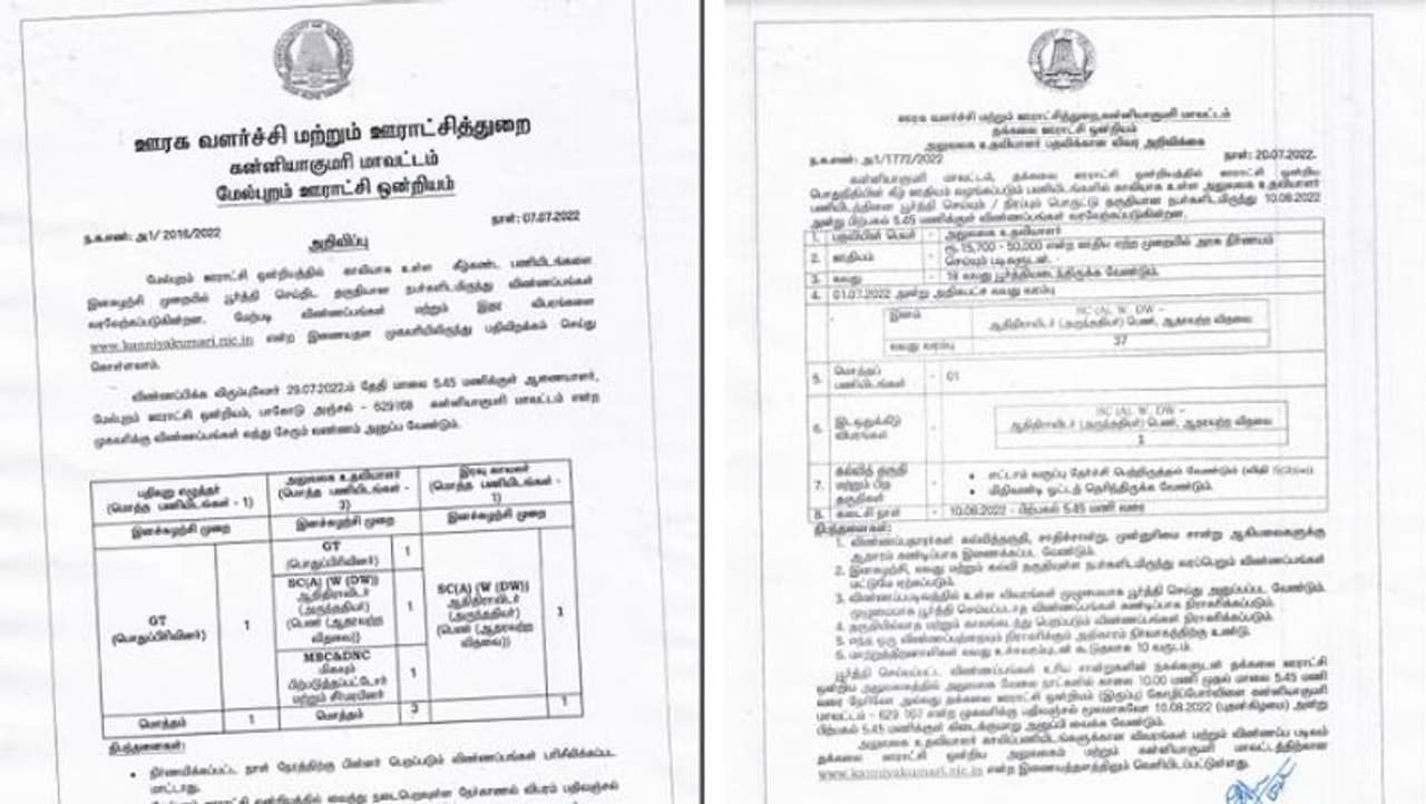 கன்னியாகுமரி மாவட்டம் ஊரக வளர்ச்சி மற்றும் ஊராட்சியில் புதிய வேலைவாய்ப்பு குறித்த அறிவிப்பு வெளியாகி இருக்கிறது. பதிவுரு எழுத்தர் , அலுவலக உதவியாளர் ,இரவு காவலர் ஆகிய பணிகளுக்கு தேர்வு நடைபெற உள்ளது. இந்த பணிக்கு விண்ணப்பிக்கும் விண்ணப்பதாரர்கள் அரசால் அங்கீகரிக்கப்பட்ட கல்வி நிலையங்களில் கட்டாயம் 8ம் வகுப்பு தேர்ச்சி பெற்றவராக இருக்க வேண்டும்.