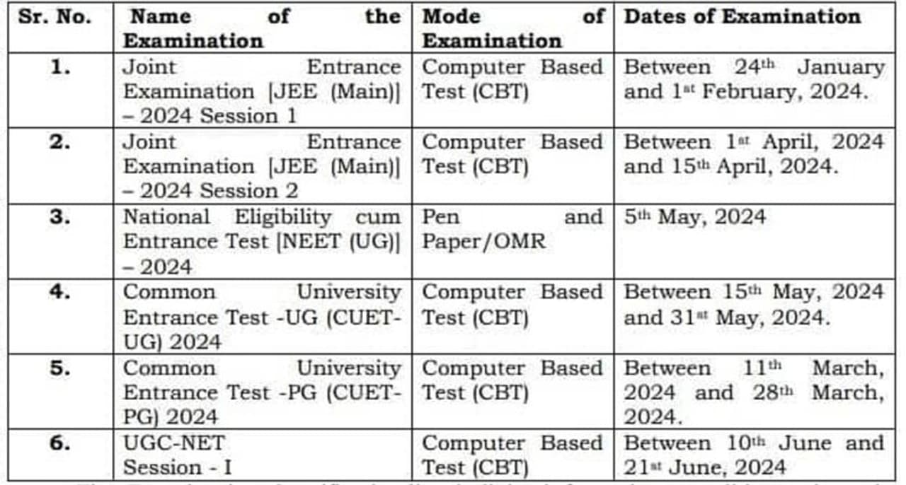 2023ஆம் ஆண்டில், ஜேஇஇ தேர்வின் முதன்மை அமர்வு 1 ஜனவரி 24 மற்றும் ஜனவரி 31 க்கு இடையில் நடைபெற்றது. இளநிலை மருத்துவப் படிப்புகளுக்கான நீட் தேர்வு 2023 மே 7 அன்று நடத்தப்பட்டது. கடந்த ஆண்டுகளின் போக்குப்படி, 2024ஆம் ஆண்டு மே 5ஆம் தேதி நடைபெறும். 2023 இல் கியூட் (CUET UG) தேர்வு மே 21 மற்றும் ஜூன் 23 முதல் கட்டங்களாக நடைபெற்றது.