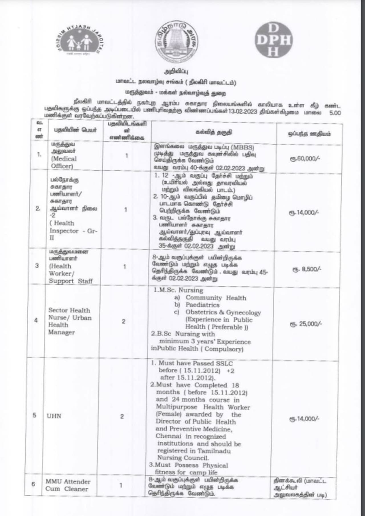 மருத்துவ அலுவலர், சுகாதார ஆய்வாளர் - Gr-II, சுகாதார பணியாளர் / துணைப் பணியாளர்கள், துறை சுகாதார செவிலியர் / நகர்ப்புற சுகாதார மேலாளர், UHN மற்றும், MMU அட்டெண்டர் கம் கிளீனர் பதவிகள்