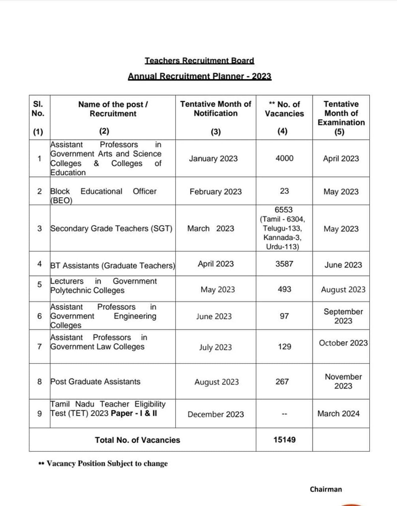 அதில், 6,304 பணியிடங்கள் - தமிழ் ஆசிரியர்கள், 133 பணியிடங்கள் - தெலுங்கு ஆசிரியர்கள், 3 பணியிடங்கள் - கன்னட ஆசிரியர்கள், 113 பணியிடங்கள் - உருது ஆசிரியர்கள் என மொத்தம் 6,553 இடைநிலை ஆசிரியர் பணியிடங்கள் நிரப்பப்படும் என்று தெரிவிக்கப்பட்டுள்ளது. மேலும் அவர்களுக்கான தேர்வு குறித்த அறிவிப்பு, 2023 ஆம் ஆண்டு மார்ச் மாதம் வெளியாக உள்ளது. அதேபோல் 3,587 பட்டதாரி ஆசிரியர் பணியிடங்கள் குறித்த அறிவிப்பு, 2023 ஆம் ஆண்டு ஏப்ரல் மாதத்தில் வெளியாக உள்ளது. அவர்களுக்கான தேர்வுகள் ஜூன் மாதத்தில் நடைபெற உள்ளன. அரசு பாலிடெக்னிக் கல்லூரிகளில் விரிவுரையாளர் பணியிடங்களும் நிரப்பப்பட உள்ளதை அடுத்து 493 பணியிடங்களுக்கான அறிவிப்பு, 2023 மே மாதத்தில் வெளியாக உள்ளதாகவும் தேர்வு ஆகஸ்ட் மாதத்தில் நடைபெறும் எனவும் தெரிவிக்கப்பட்டுள்ளது.