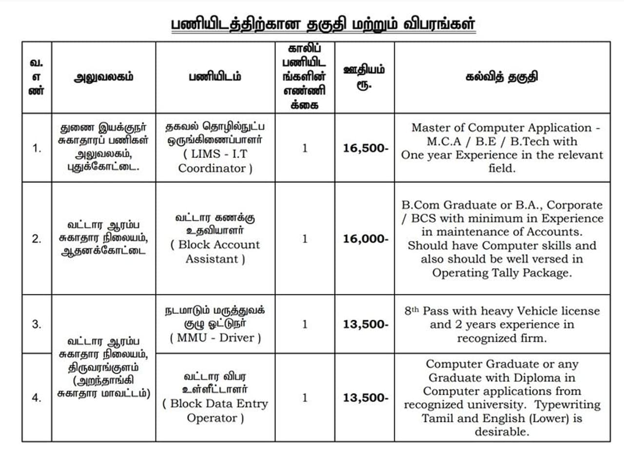 புதுக்கோட்டை மாவட்ட நலவாழ்வுச் சங்கம், புதுக்கோட்டை மற்றும் அறந்தாங்கி சுகாதார மாவட்ட் துணை இயக்குநர், சுகாதாரப் பணிகள் அலுவலகங்கள் மற்றும் அதன் கட்டுப்பாட்டின் கீழ் இயங்கி வரும் அரசு ஆரம்ப சுகாதார நிலையங்களில் கீழ்கண்ட ஒப்பந்தப் பணியிடங்கள் காலியாக உள்ளன.