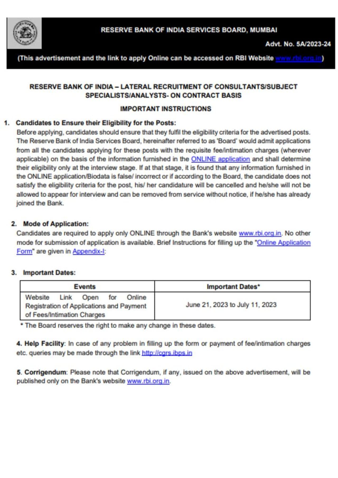 மேற்கூறிய பணிகளுக்கான தேர்வு ஆர்பிஐ விதிமுறைகளுக்கு ஏற்ப நடைபெறும். மேலே குறிப்பிட்டுள்ள பதவிகளுக்கு விண்ணப்பிக்க விரும்பும் விண்ணப்பதாரர்கள் கீழே பகிரப்பட்டுள்ள விரிவான அறிவிப்பின் மூலம் தகுதி அளவுகோல் மற்றும் தேர்வு செயல்முறையை சரிபார்க்கலாம்.