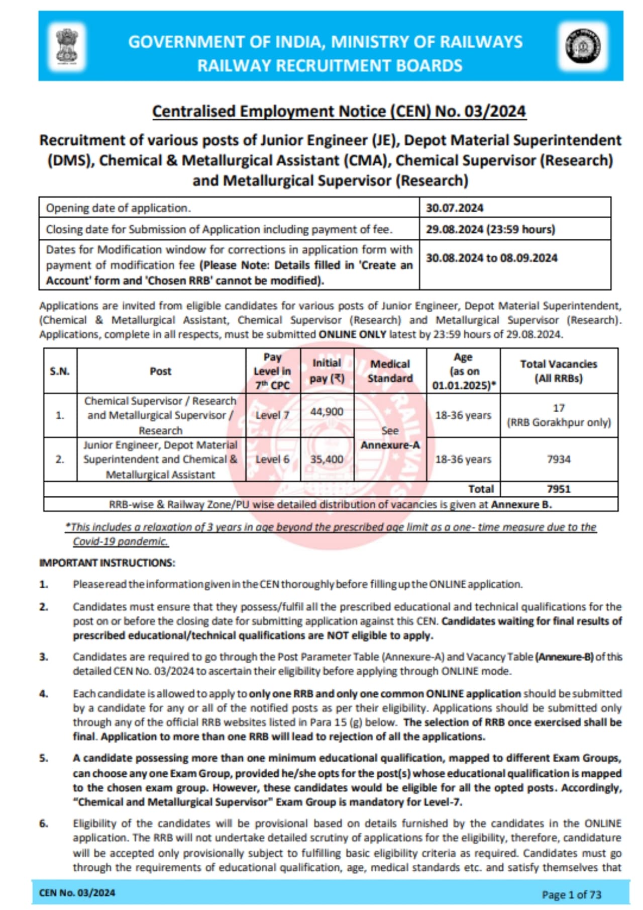 ரயில்வே ஆட்சேர்ப்பு வாரியம் (RRB) இந்திய ரயில்வேயில் 7,951 வேலை காலியிடங்களை நிரப்பும் அறிவிப்பை வெளியிட்டுள்ளது. விண்ணப்பிக்கும் தேர்த்தியானது ஜூலை 30 அன்று தொடங்கியது. ஆகஸ்ட் 29 வரை திறந்திருக்கும். காலியிடங்களில் ஜூனியர் இன்ஜினியர் (JE) மற்றும் மெட்டீரியல் சூப்பிரண்டுக்கான 7,934 பணியிடங்களும், ரசாயன மேற்பார்வையாளர், உலோகவியல் உதவியாளர் மற்றும் ஆராய்ச்சிப் பணிகளுக்கான 17 பணிகளும் அடங்கும். ஆர்வமுள்ள விண்ணப்பதாரர்கள் அதிகாரப்பூர்வ ஆர்ஆர்பி (RRB) இணையதளம் மூலம் விண்ணப்பிக்கலாம். அதிகாரபூர்வ ஆர்ஆர்பி இணையதளத்திற்குச் சென்று விண்ணப்பிக்கலாம் என்று தெரிவிக்கப்பட்டுள்ளது.