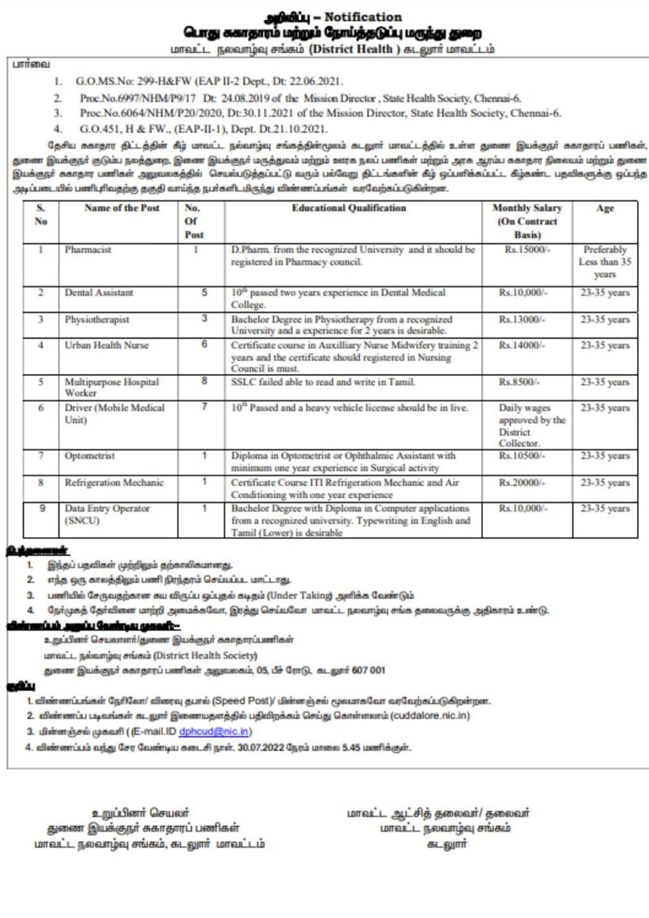 30.07.2022 என்பது இப்பணிக்கு விண்ணப்பிக்க கடைசி நாள் ஆகும். விண்ணப்பதாரர்கள் தேர்வு செய்யப்பட்டு பணியமர்த்தப்படும் பணிக்கு தகுந்தாற்போல் குறைந்தபட்சம் ரூ.8,500/- முதல் அதிகபட்சம் ரூ.20,000/- வரை மாத ஊதியமாக வழங்கப்படும் என்று அறிவிக்கப்பட்டுள்ளது. மேலும் தகவல்களை விண்ணப்பதாரர்கள் இணையதளத்தின் மூலம் தெரிந்து கொள்ளலாம்.