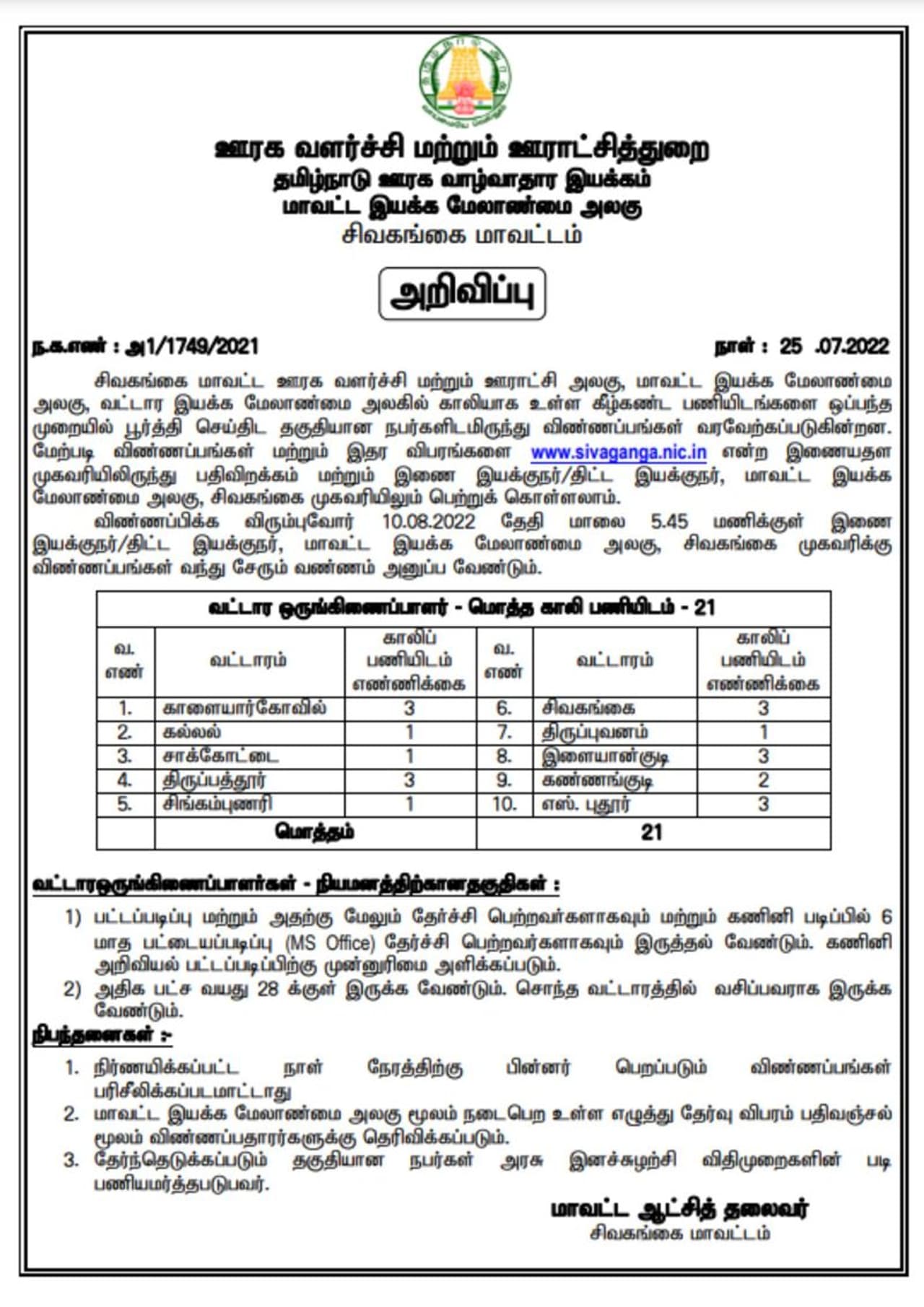 சிவகங்கை மாவட்ட ஊரக வளர்ச்சி மற்றும் ஊராட்சி அலகு, மாவட்ட இயக்க மேலாண்மை அலகு, வட்டார இயக்க மேலாண்மை அலகில் காலியாக உள்ள பணியிடங்களுக்கு வேலைவாய்ப்பு அறிவிப்பு வெளியாகி உள்ளது.