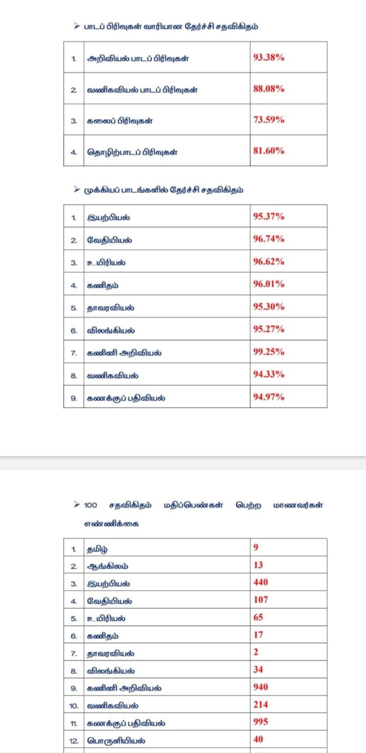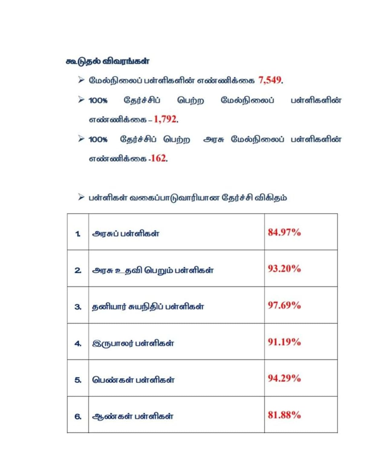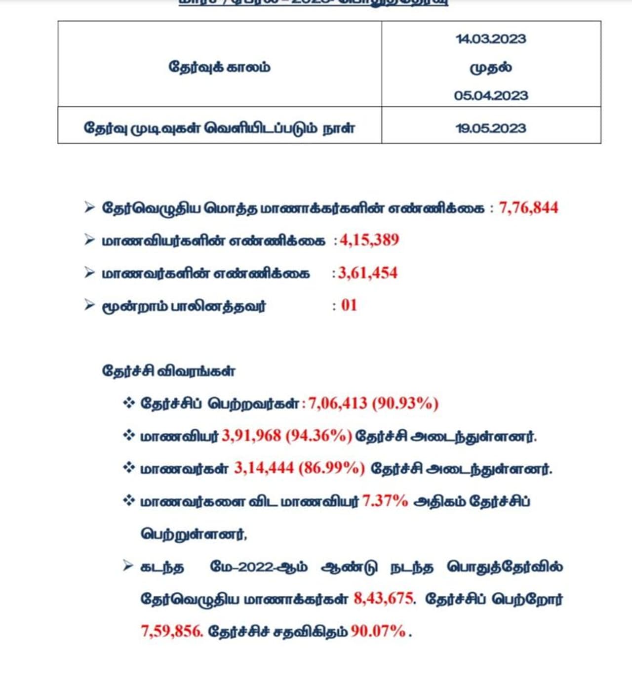 மாணவர்களை விட மாணவியர்கள் 7.37% அதிகம் தேர்ச்சி பெற்றுள்ளனர். கடந்த ஆண்டு 90.07% பேர் தேர்ச்சி பெற்றிருந்த நிலையில் 0.86% அதிகரித்துள்ளது. தேர்வு எழுதிய 7,76,844 பேரில் 7,06,413 பேர் தேர்ச்சி பெற்றுள்ளனர். 11ம் பொதுத்தேர்வு தேர்ச்சி விகிதத்தில் திருப்பூர் மாவட்டம் முதலிடத்தில் உள்ளது. திருப்பூர் - 96.38%, ஈரோடு - 96.18%, கோவை - 95.73%, நாமக்கல் - 95.60%, தூத்துக்குடி - 95.43% இடம்பெற்றுள்ளது.