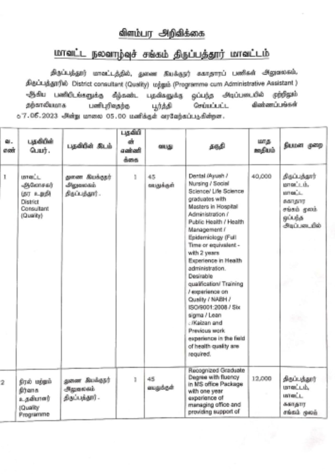 மாவட்ட சுகாதார அமைப்பில் வேலை வாய்ப்பு அறிவிப்பு வெளியாகி உள்ளது. அதன் முழு விபரங்களை காணலாம்.