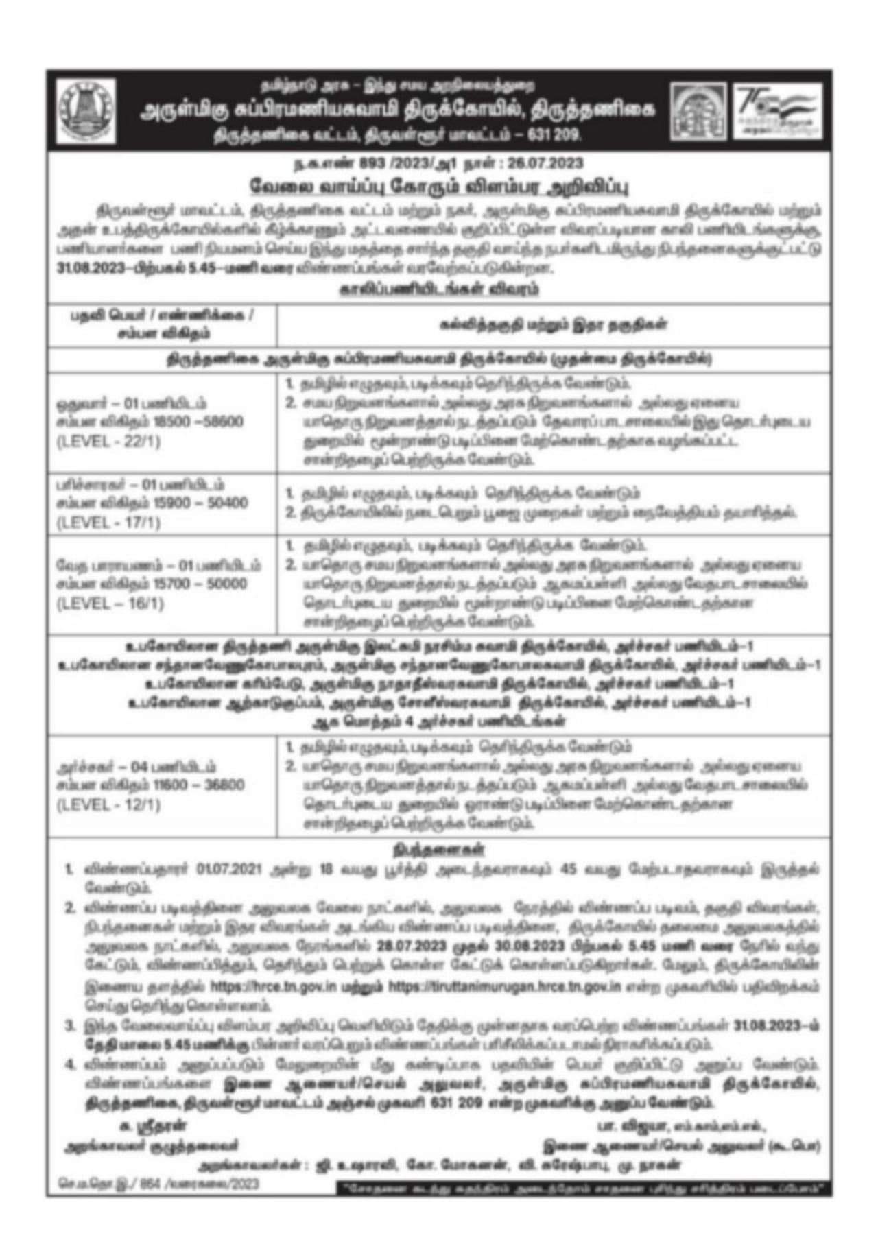 இந்து சமய மற்றும் அறநிலையத் துறை (TNHRCE) தங்கள் நிறுவனத்தில் 7 வேலை காலியிடங்களை அறிவித்துள்ளது. இந்த குறுகிய அறிவிப்புக்கு ஆர்வமும் தகுதியும் உள்ளவர்கள், 28.07.2023 முதல் 30.08.2023 வரை ஆன்லைனில் விண்ணப்பிக்கலாம். இப்பணியை பற்றிய விவரங்களான வயது வரம்பு, விண்ணப்பக் கட்டணம், சம்பள விவரங்கள், விண்ணப்பிக்கும் முறை போன்றவற்றை பார்க்கலாம்.