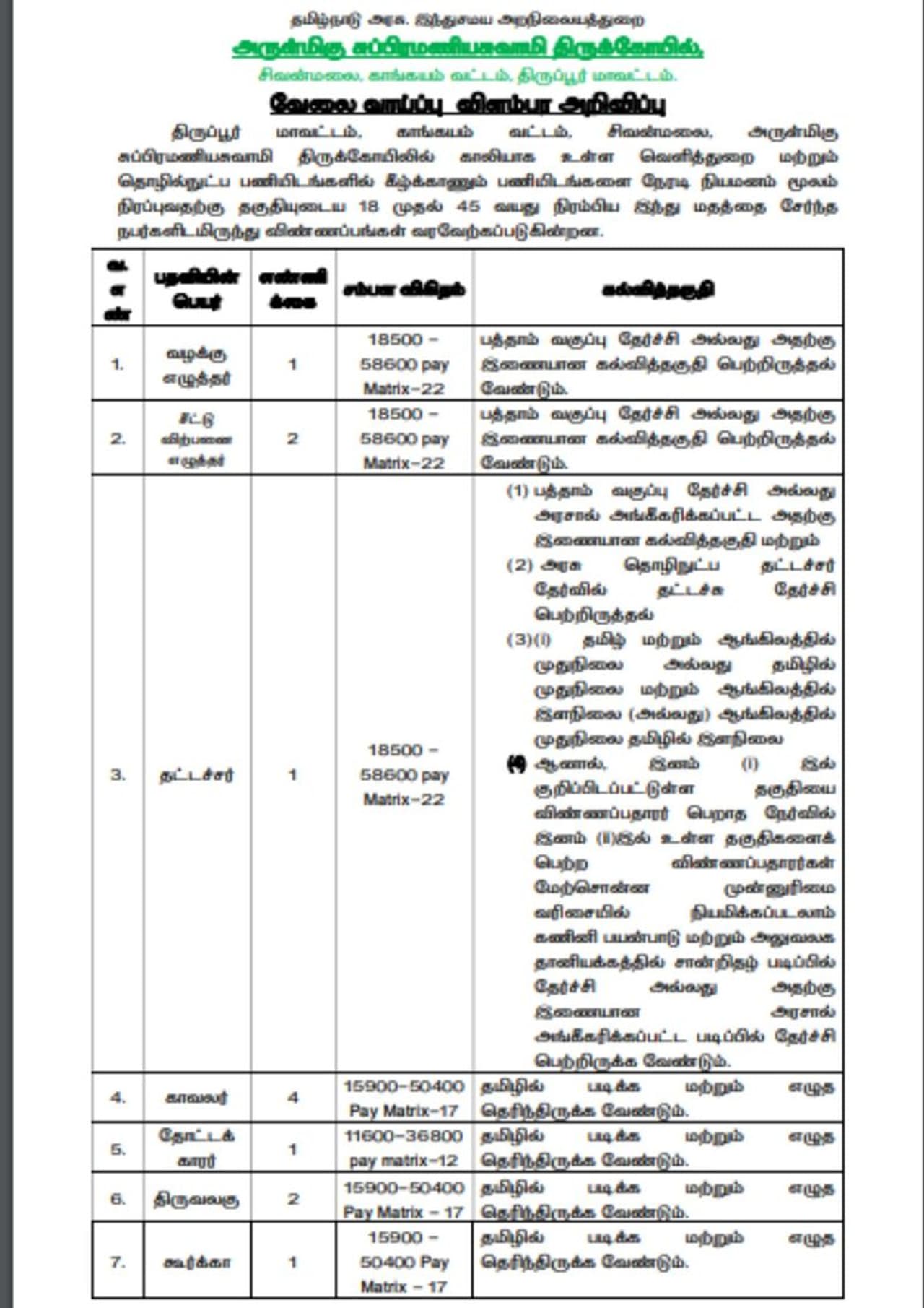இந்து சமய மற்றும் அறநிலையத் துறை காலியாக உள்ள பணியிடங்களுக்கு வேலை வாய்ப்பு அறிவிப்பை வெளியிட்டுள்ளது.