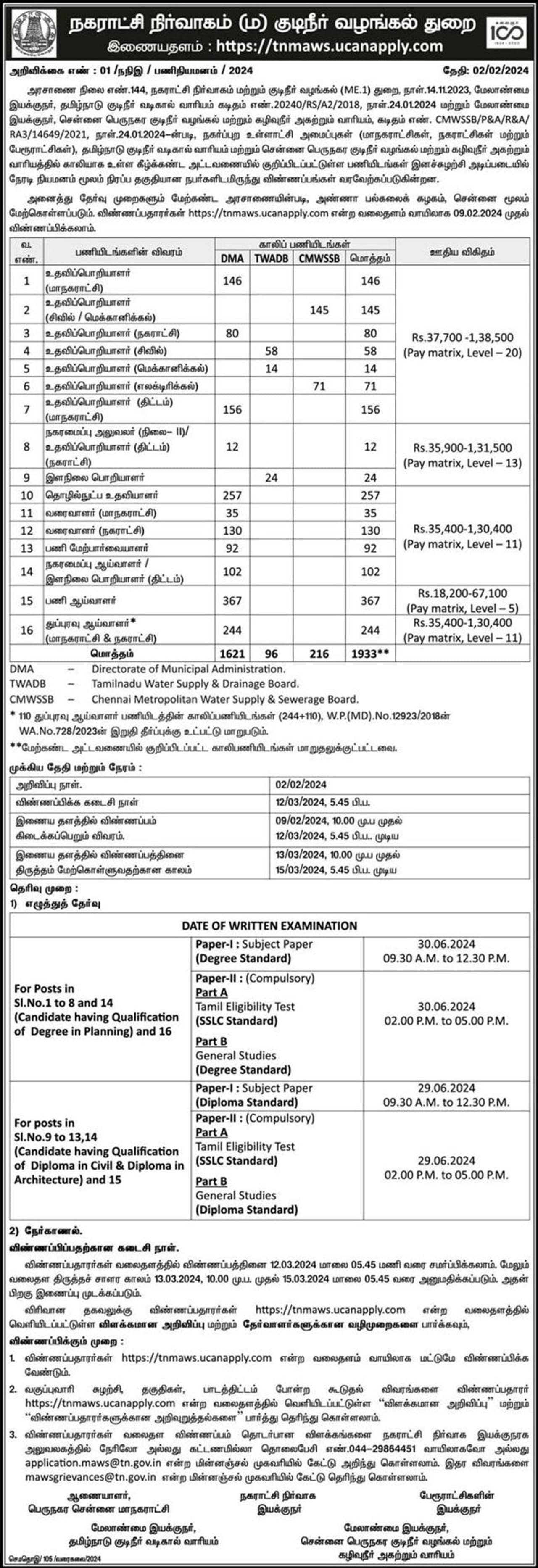 தமிழ்நாட்டில் உள்ள மாநகராட்சி, நகராட்சி, பேரூராட்சி, குடிநீர் வடிகால் வாரியம் உள்ளிட்ட இடங்களில் உள்ள காலிப்பணியிடங்களுக்கான அறிவிப்பு வெளியாகி உள்ளது.