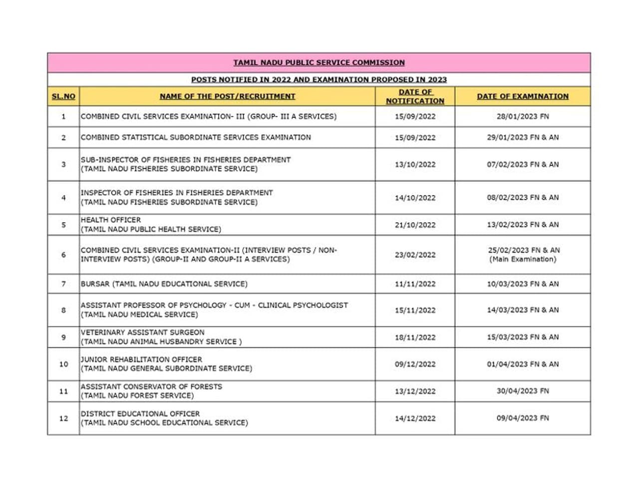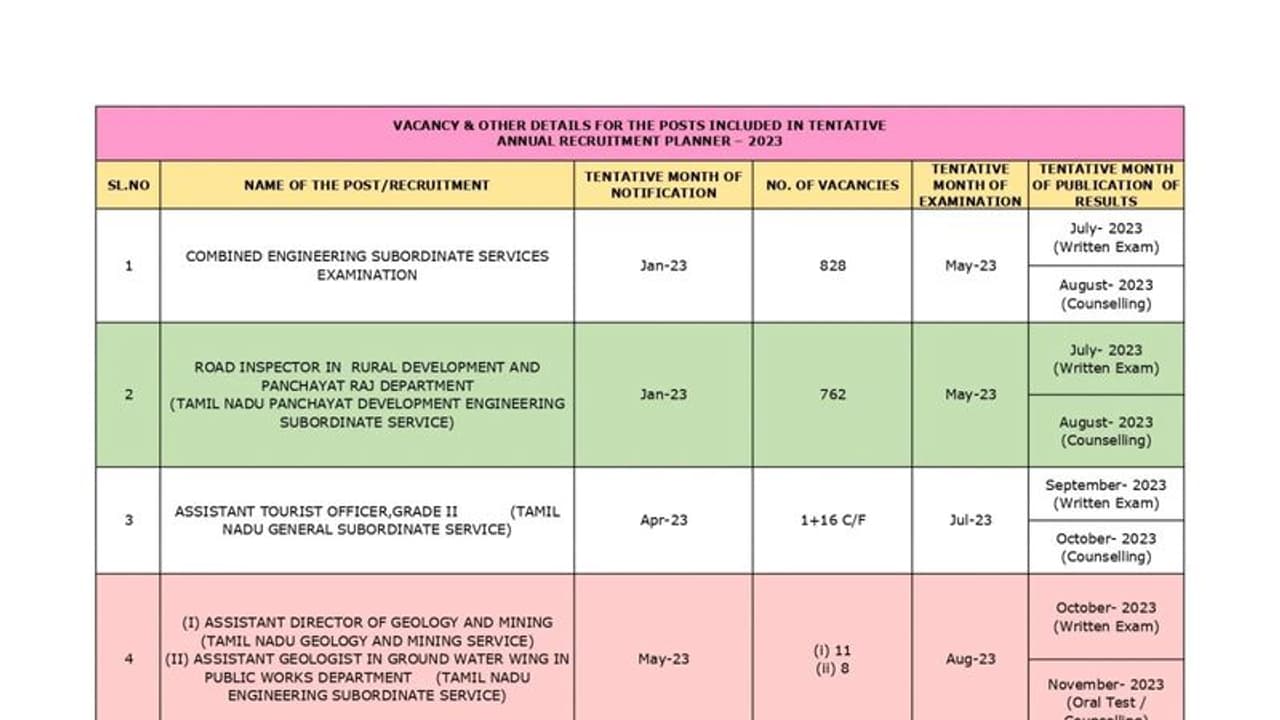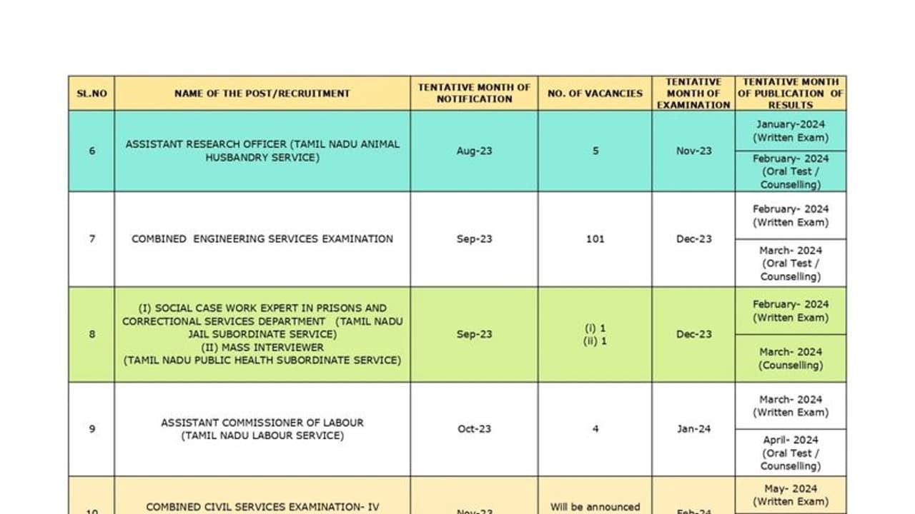 ஒவ்வொரு ஆண்டும் அரசு சார்பில் நடத்தப்படும் குரூப் 1, குரூப் 2, குரூப் 3, குரூப் 4 போன்ற தேர்வுகளின் அட்டவணையை ஆண்டு அட்டவணையாக வெளியிடுவது வழக்கம். அந்த வகையில் தமிழ்நாடு அரசு பணியாளர் தேர்வாணையம் 2023ம் ஆண்டுக்கான தேர்வு அட்டவணை, தேர்வு முடிவுகள் வெளியாகும் விவரத்தை வெளியிட்டுள்ளது.