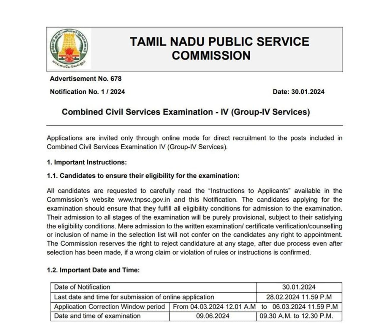 தமிழ்நாடு அரசுத் துறைகளில் காலியாக உள்ள கிராம நிர்வாக அலுவலர், இளநிலை உதவியாளர், தட்டச்சர் உள்ளிட்ட 11 வகையான பணிகளுக்கு ஆண்டுதோறும் குரூப்-4 தேர்வு நடத்தப்பட்டு வருகிறது.