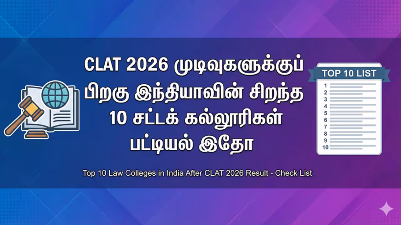 Top 10 Law Colleges CLAT 2026 தேர்வு முடிவுகள் வெளியானது. இந்தியாவின் சிறந்த 10 சட்டக் கல்லூரிகள் எவை? அட்மிஷன் முறை மற்றும் முழு விவரங்களை இங்கே காணுங்கள்.