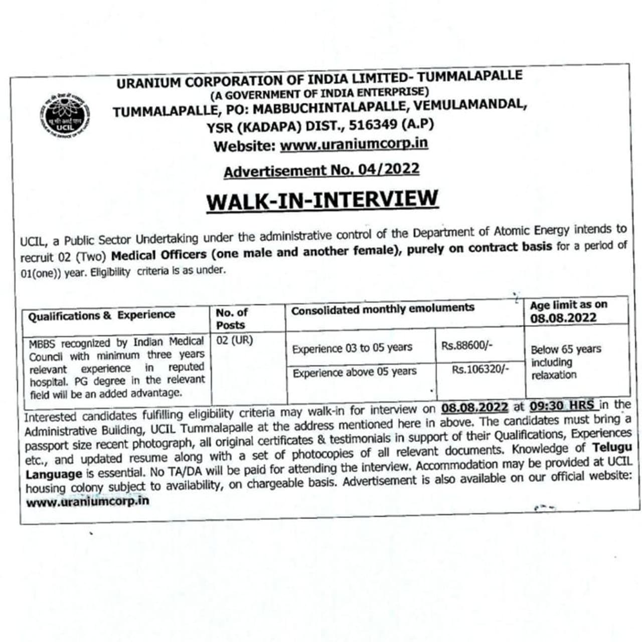 யுரேனியம் கார்ப்பரேஷன் ஆஃப் இந்தியா லிமிடெட் நிறுவனம் தற்போது வேலைவாய்ப்பு குறித்த அறிவிப்பை வெளியிட்டு உள்ளது.