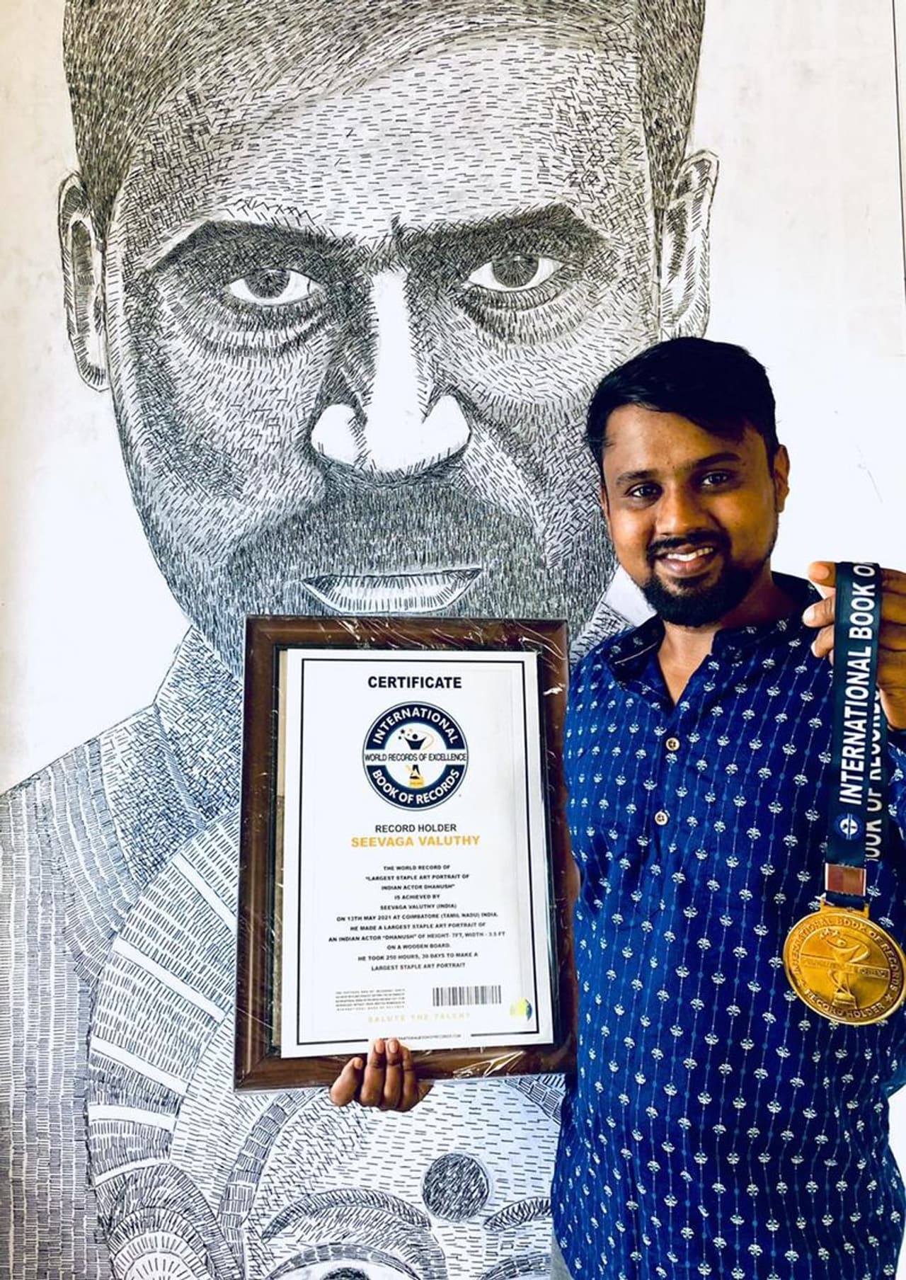 இந்நிலையில், கர்ணன் படத்தில் தனுஷ் காட்டு பேச்சி முன்பு அமர்ந்திருப்பது போல்... ஓவியர் சீவக வழுதி சுமார் 1 மில்லியனுக்கும் அதிகமான ஸ்டேப்லர் பின்னால் தனுஷின் ஓவியத்தை வரைந்து சாதனை செய்துள்ளார். இவரது இந்த சாதனை இன்டர்நேஷனல் புக் ஆப் ரெகார்டில் இடம்பெற்றுள்ளது. இந்த புகைப்படத்தை தயாரிப்பாளர் தாணு தன்னுடைய சமூக வலைதள பக்கத்தில் வெளியிட்டு வாழ்ந்து தெரிவித்துள்ளார்.