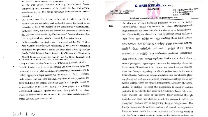 அதில் ‘சிக்ஸர்’படத்தில் கவுண்டமணியின் புகழைக் கெடுக்கும் வகையில் கதாநாயகனின் தாத்தாவாக அவருடைய புகைப்படம் மாட்டப்பட்டு மிகவும் கொச்சையான வசனங்கள் பேசப்பட்டிருப்பதாகவும் அதற்கு அவருடைய முன் அனுமதி பெறப்படவில்லை என்றும் அந்தக் காட்சிகளை நீக்காவிட்டால் படத்தின் இயக்குநர் சாச்சி, கதாநாயகன் வைபவ் உள்ளிட்ட படக்குழுவினர் மீது சட்ட ரீதியான நடவடிக்கை எடுக்கப்படும் என்றும் தெரிவிக்கப்பட்டுள்ளது.
