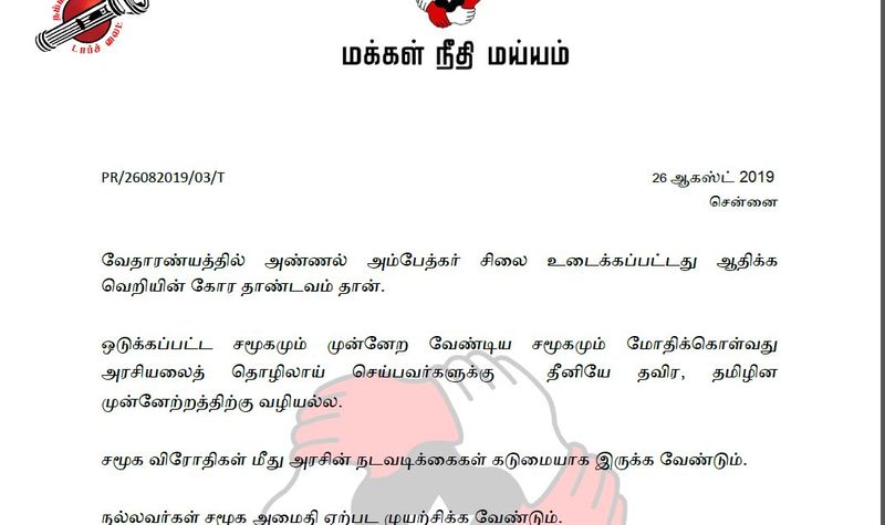 இந்நிலையில் மக்கள் நீதி மய்யம் தலைவர் கமல் இதுகுறித்து தனது கண்டனத்தை பதிவிட்டுள்ளார். அவரது பதிவில்,...வேதாரண்யத்தில் அண்ணல் அம்பேத்கர் சிலை உடைக்கப்பட்டது ஆதிக்க வெறியின் கோர தாண்டவம் தான். ஒடுக்கப்பட்ட சமூகமும் முன்னேற வேண்டிய சமூகமும் மோதிக்கொள்வது அரசியலைத் தொழிலாய் செய்பவர்களுக்கு தீனியே தவிர, தமிழன முன்னேற்றத்திற்கு வழியல்ல. சமூக விரோதிகள் மீது அரசின் நடவடிக்கைகள் கடுமையாக இருக்க வேண்டும். நல்லவர்கள் சமூக அமைதி ஏற்பட முயற்சிக்க வேண்டும்...என்று பதிவிட்டுள்ளார்.