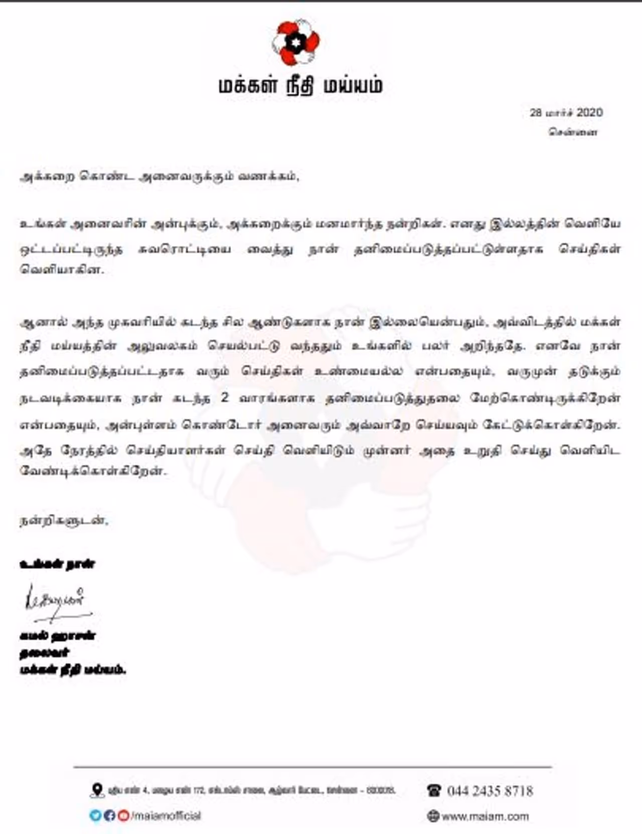 உங்கள் அனைவரின் அன்பிற்கும் அக்கறைக்கும் மனமார்ந்த நன்றிகள். எனது இல்லத்தின் வெளியே ஒட்டப்பட்டிருந்த சுவரொட்டியை வைத்து நான் தனிமைப்படுத்தப்பட்டு உள்ளதாக செய்திகள் வெளியாகின. ஆனால் அந்த முகவரியில் கடந்த சில ஆண்டுகளாக நான் இல்லை என்பதும், அவ்விடத்தில் மக்கள் நீதி மையத்தின் அலுவலகம் செயல்பட்டு வந்ததும் உங்களில் பலர் அறிந்ததே.