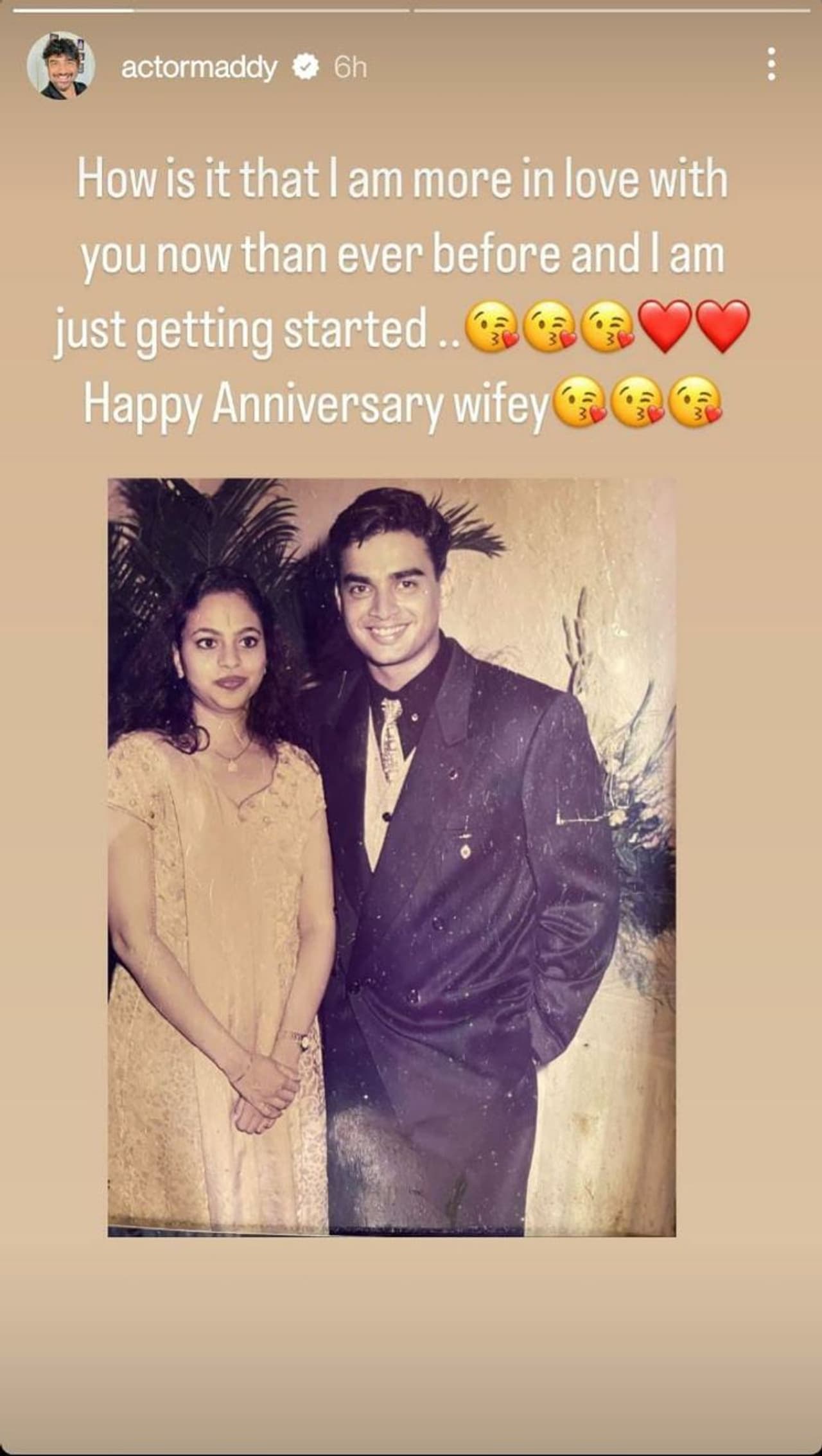 அதன்படி இன்ஸ்டாகிராமின் தனது மனைவியுடன் எடுத்த பழைய புகைப்படம் ஒன்றை பகிர்ந்துள்ளார் மாதவன், அதில் கோர்ட் சூட் அணிந்து அவர் ஸ்டைலாக நிற்க அவருக்கு அருகில் அவரது மனைவி சரிதா, சிரித்தபடி போஸ் கொடுத்துள்ளார். மேலும் அதில் “முன்னெப்போதும் இல்லாத அளவு இப்போது நான் உன்னை மிகவும் காதலிக்கிறேன். இனிய திருமண நாள் வாழ்த்துக்கள் பொண்டாட்டி” என பதிவிட்டுள்ளார்.