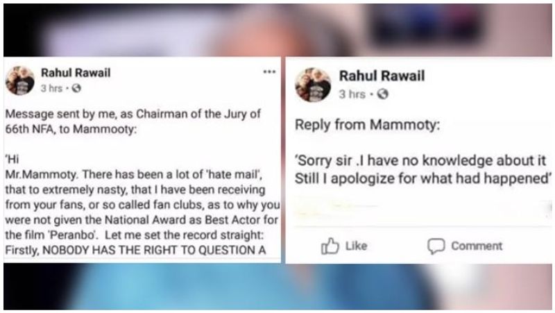 ஆனால் விருது பட்டியலில் மம்முட்டி பெயர் இல்லை என்று தெரிந்ததுமே தேர்வுக்குழு தலைவர்களில் ஒருவரான ராகுல் ராவிலின் பேஸ்புக் பக்கத்தை அவரது ரசிகர்கள் ஒட்டுமொத்தமாக ஆக்கிரமிக்க தொடங்கினர். கடும் சொற்களை பயன்படுத்தி ராகுல் ராவிலை வசைபாடினர். இதனால் ராகுல், மம்முட்டிக்கு ஒரு கோரிக்கை ஒன்றை வைத்தார். அதில், ``மிஸ்டர் மம்முட்டி உங்கள் ரசிகர்கள் என்னை நோக்கி வெறுப்பான சொற்களை பயன்படுத்தி பதிவிட்டு வருகின்றனர். `பேரன்பு’ படத்துக்கு தேசிய விருது கொடுக்கவில்லை என என்னைக் கேள்வி கேட்டு வருகின்றனர். அதற்கு விளக்கம் அளிக்கிறேன். முதலில் ஒன்றை சொல்கிறேன். நடுவரின் தீர்ப்பை யாரும் கேள்வி கேட்க முடியாது.