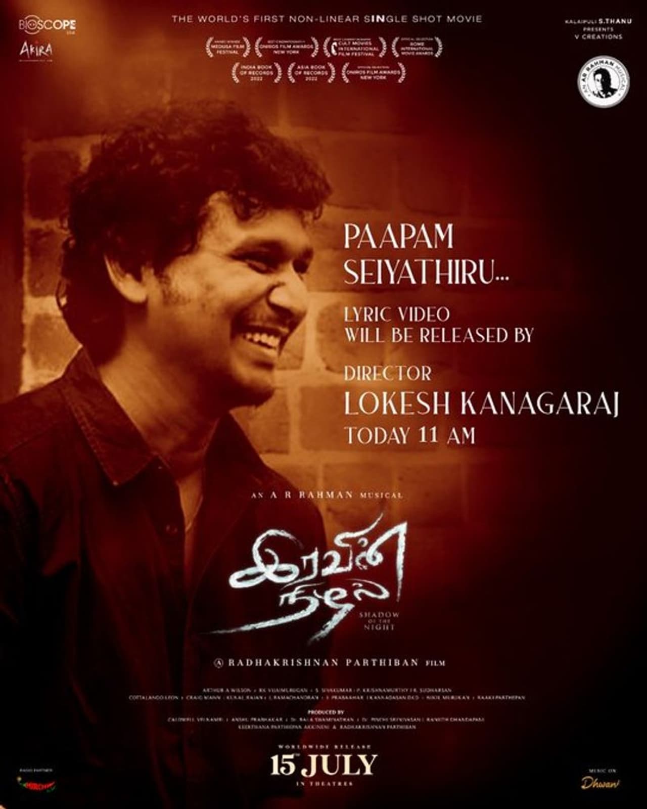 பார்த்திபன் இயக்கி, எழுதி, நடித்திருக்கும் 'இரவின் நிழல்' திரைப்படம் ஜூலை 15 ஆம் தேதி, உலகம் முழுவதும் வெளியாக உள்ள நிலையில் இந்த படத்தில் இடம்பெற்றுள்ள 'பாபம் செய்யாதிரு' என்கிற பாடலை இயக்குனர் லோகேஷ் கனகராஜ் இன்று வெளியிட்டுள்ளார்.