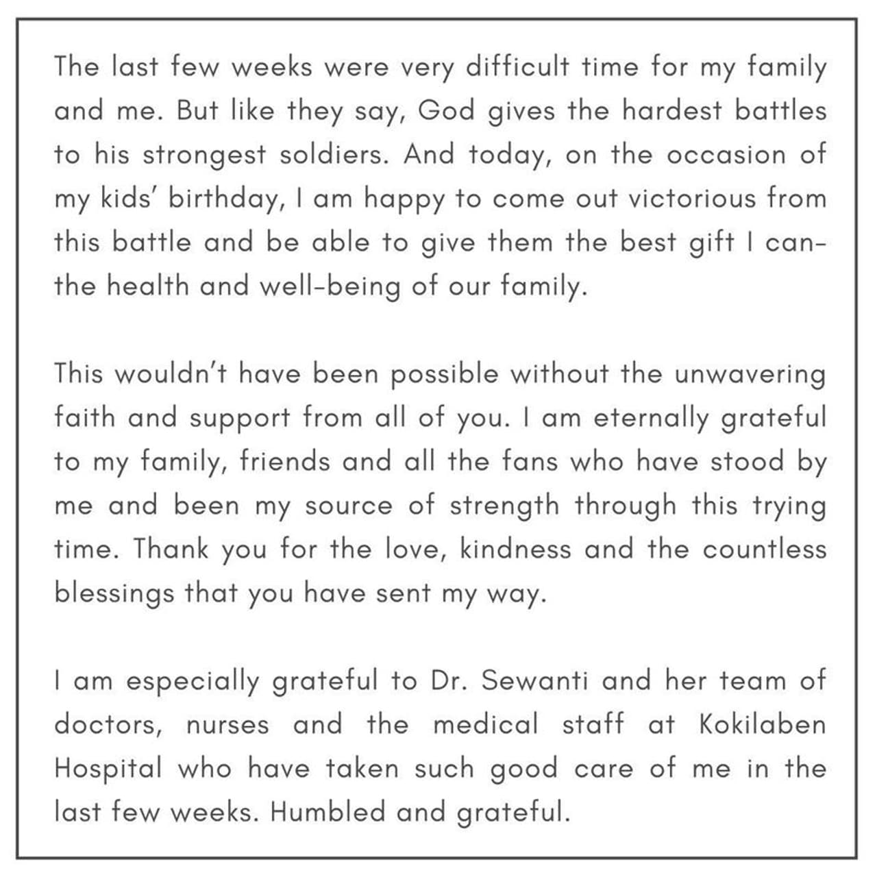 உங்களது அசைக்க முடியாத நம்பிக்கை மற்றும் ஆதரவு இல்லாமல் இது சாத்தியப்பட்டிருக்காது. என்னுடன் நின்ற, இந்தக் கடினமான கட்டத்தில் எனக்குத் தெம்பாக இருந்த எனது குடும்பம், நண்பர்கள் மற்றும் அத்தனை ரசிகர்களுக்கும் நான் வாழ்நாள் முழுவதும் நன்றியுடன் இருப்பேன். அனைத்து அன்பு, கனிவு, கணக்கில் அடங்காத ஆசிர்வாதங்களுக்கு நன்றி. கோகிலாபென் மருத்துவமனையில் இருக்கும் மருத்துவர் செவாந்தி, அவரது மருத்துவர் குழு, செவிலியர்கள், ஊழியர்கள் ஆகியோருக்கு குறிப்பாக என் நன்றி. கடந்த சில வாரங்களாக என்னை அவ்வளவு நன்றாகப் பார்த்துக் கொண்டனர்” என பதிவிட்டுள்ளார்.