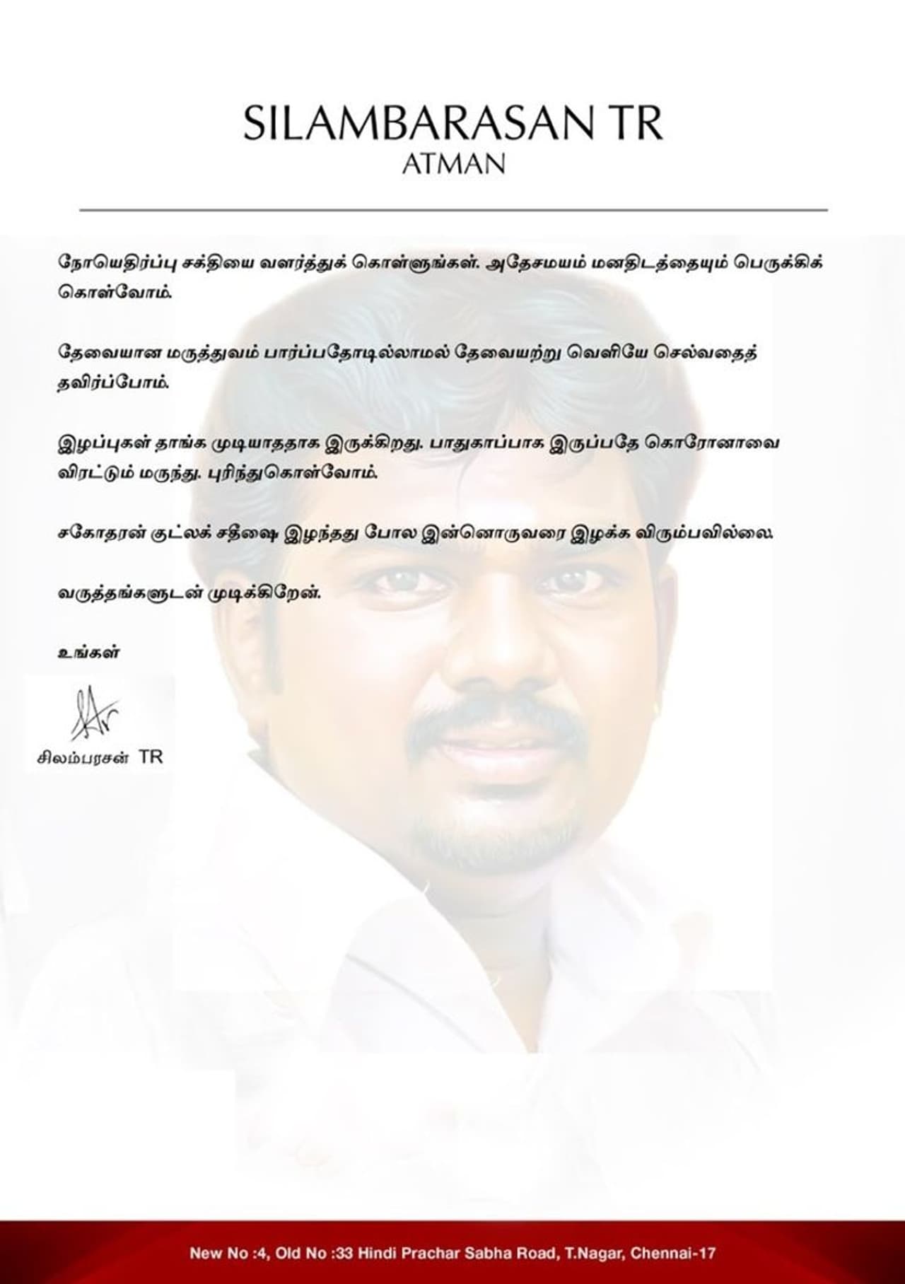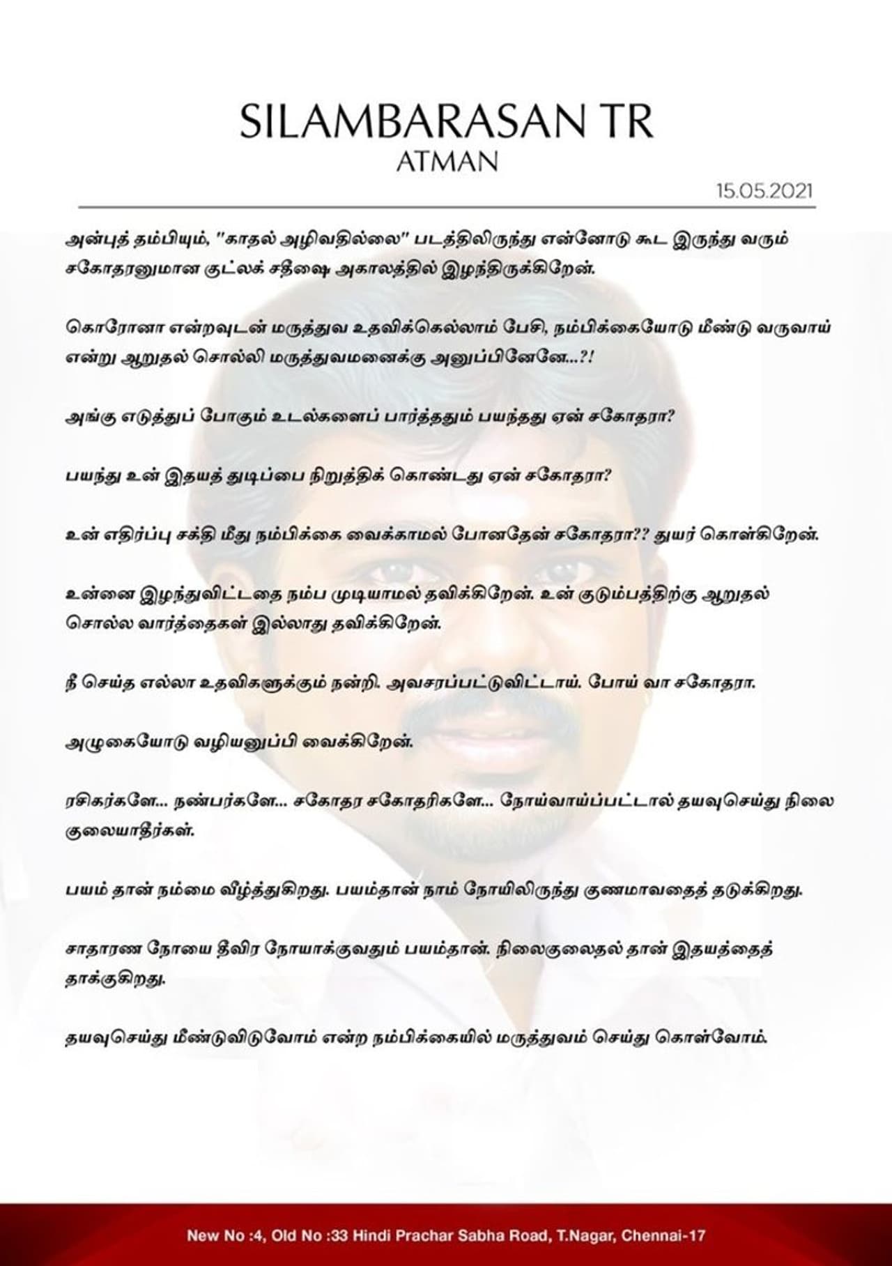 இவ்வாறு சிம்பு அந்த கடிதத்தில் குறிப்பிட்டுள்ளார்.