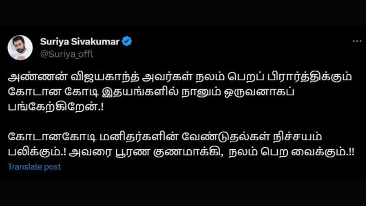 இந்த நிலையில் நடிகர் சூர்யா எக்ஸ்-ல் வெளியிட்டுள்ள பதிவில், “அண்ணன் விஜயகாந்த் அவர்கள் நலம் பெறப் பிரார்த்திக்கும் கோடான கோடி இதயங்களில் நானும் ஒருவனாகப் பங்கேற்கிறேன்.! கோடானகோடி மனிதர்களின் வேண்டுதல்கள் நிச்சயம் பலிக்கும்.! அவரை பூரண குணமாக்கி, நலம் பெற வைக்கும்.!!” என்று பதிவிட்டுள்ளார்.