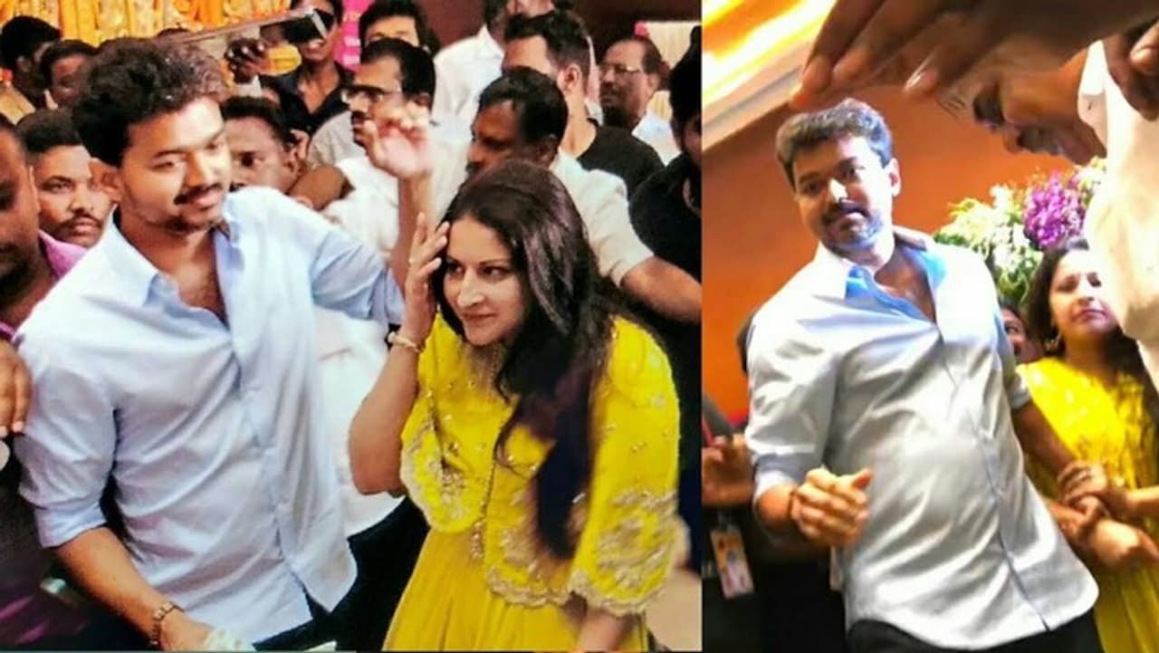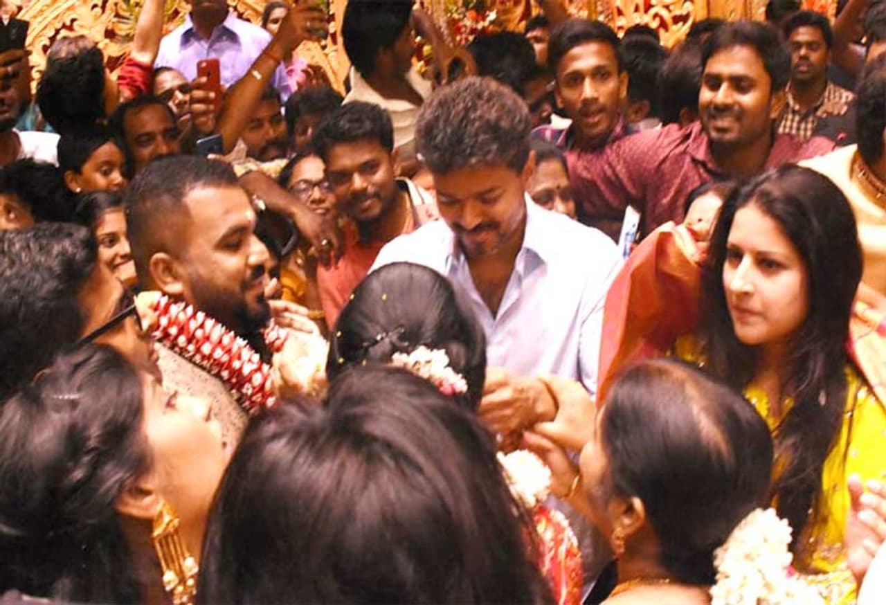 ஆனால் விஜய் தனது மனைவியை அரவணைத்தபடி நீண்ட நேரம் போராடி மணமக்கள் அருகில் சென்று வாழ்த்திவிட்டு பரிசு கொடுத்துவிட்டு புறப்பட்ட ஆயத்தமானார். ஆனால் அதற்குள் மேடை முழுவதும் ரசிகர்கள் ஏறி இருந்தனர். இதனால் விஜயால் அங்கிருந்து நகரக்கூட முடியவில்லை. ஒரு கட்டத்தில் விஜய் ரசிகர் மன்றத்தின் தொண்டர்படை ரசிகர்களை மூர்க்கத்தனமாக தள்ளிவிட்டு விஜயை காருக்கு அழைத்துச் சென்றனர்.