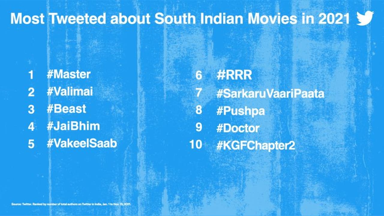 அதன்படி இந்த ஆண்டு அதிகம் டுவிட் செய்யப்பட்ட தென்னிந்திய படங்களின் பட்டியலில் லோகேஷ் கனகராஜ் இயக்கத்தில் விஜய் நடித்த மாஸ்டர் திரைப்படம் முதலிடம் பிடித்துள்ளது. அடுத்த இடத்தில் எச்.வினோத் - அஜித் கூட்டணியில் உருவாகி உள்ள ‘வலிமை’ உள்ளது. விஜய் நடித்து வரும் பீஸ்ட் மற்றும் சூர்யா நடிப்பில் அண்மையில் வெளியான ஜெய் பீம் ஆகிய படங்கள் 3 மற்றும் 4ம் இடத்தில் உள்ளன.