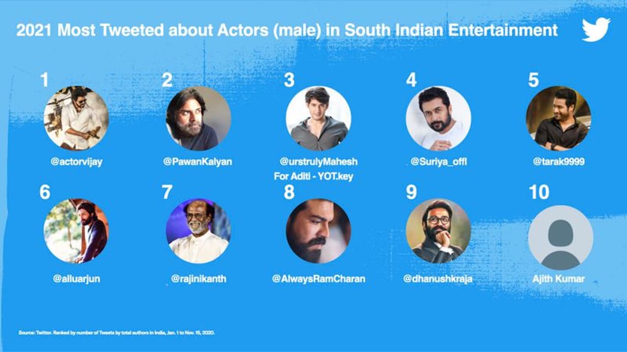 2021-ம் ஆண்டில் அதிகம் டுவிட் செய்யப்பட்ட நடிகர்களின் பட்டியலில் நடிகர் விஜய் முதலிடம் பிடித்துள்ளார். பவர் ஸ்டார் பவன் கல்யாண் இரண்டாவது இடத்திலும், தெலுங்கு சூப்பர் ஸ்டார் மகேஷ் பாபு 3வது இடத்திலும் உள்ளனர். சூர்யா 4வது இடத்திலும், ஜூனியர் என்டிஆர் 5வது இடத்திலும், அல்லு அர்ஜுன் 6வது இடத்திலும், ரஜினி 7வது இடத்திலும், ராம் சரண் 8வது இடத்திலும், தனுஷ் 9வது இடத்திலும், அஜித் 10வது இடத்திலும் உள்ளனர். கடந்தாண்டு 3-வது இடத்தில் இருந்த நடிகர் விஜய் இந்தாண்டு முதலிடம் பிடித்துள்ளது குறிப்பிடத்தக்கது.