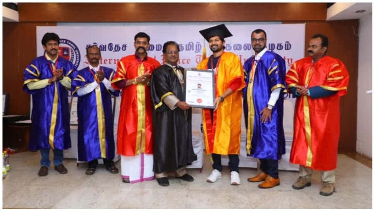 கொரோனா தொற்று அதிகரிக்கும்போது மக்களுக்கு சேவை செய்ததற்காக ’சர்வதேச அமைதி தமிழ் பல்கலைக்கழகம்' நடிகர் விஜய் விஸ்வாவுக்கு கெளரவ டாக்டர் பட்டம் வழங்கியுள்ளது
