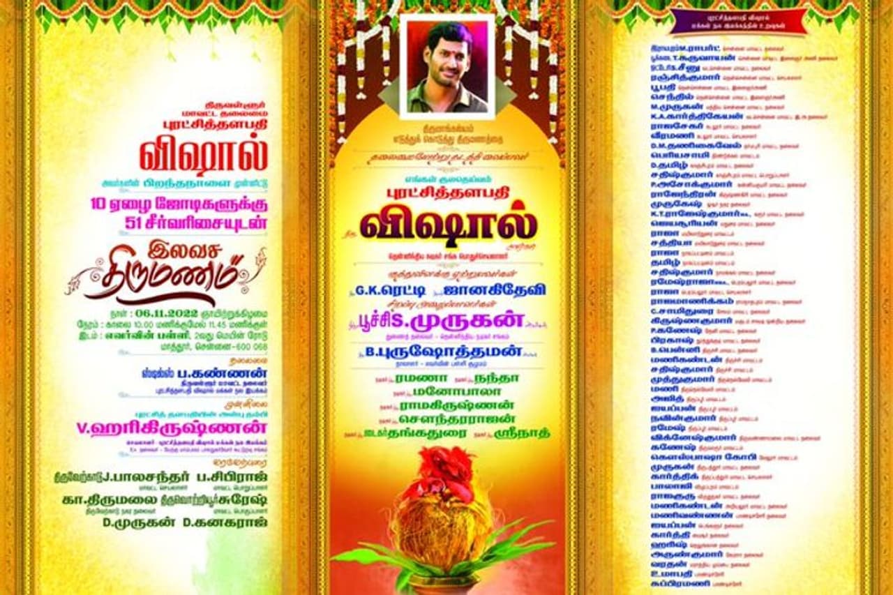 விஷால் 11 ஏழை ஜோடிகளுக்கு திருமணம் செய்து வைத்த கையேடு... சுமார் 51 பொருட்கள் அடங்கிய குடும்பத்திற்கு மிகவும் தேவையான 51 சீர் வரிசை பொருட்களையும் வழங்கியுள்ளார். இதற்கான ஏற்பாடுகளை விஷால் மக்கள் இயக்கத்தை சேர்ந்தவர்களும் செய்திருந்தனர் என்பது குறிப்பிடத்தக்கது. விஷால் மாத்தூர் பகுதிக்கு வந்தபோது, ரசிகர்கள் அவருக்கு அமோக வரவேற்பை கொடுத்தனர். இதுகுறித்த புகைப்படங்கள், மற்றும் வீடியோக்கள், சமூக வலைத்தளத்தில் வைரலாகி வருகிறது.