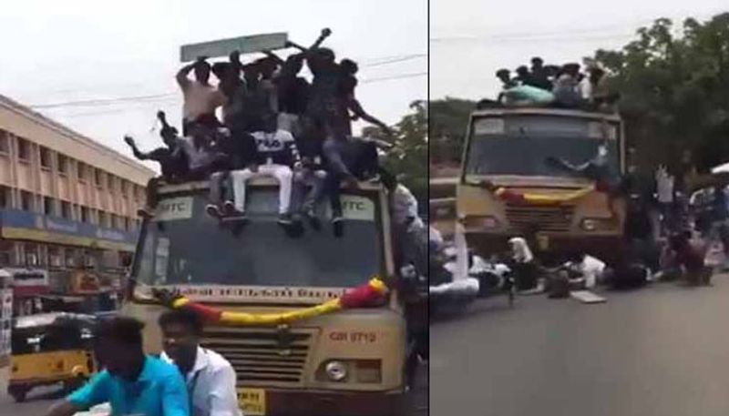 பேருந்தின் மீது ஏறியும் மாணவர்கள் சிலர் கத்தி கோஷமிட்டனர். மாணவர்களின் இந்த செயலால் அங்கு போக்குவரத்து பாதிப்பு ஏற்பட்டது. மேலும் பஸ்ஸின் மேற்கூரையில் மீது ஏறி பஸ்ஸில் கூச்சலிட்டுக் கொண்டே சென்றனர். அப்போது திடீரென டிரைவர் பிரேக் போடவே, பேருந்தின் மேற்கூரையிலிருந்து மாணவர்கள் கொத்துக்கொத்தாக கீழே விழுந்தனர்.