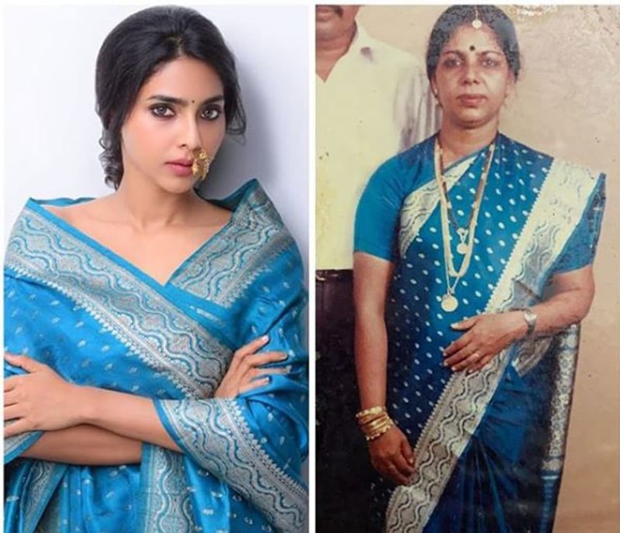 அந்த வகையில் நடிகை ஐஸ்வர்யா லட்சுமி, தனது இன்ஸ்டாகிராம் பக்கத்தில் அவருடைய அம்மாவின் பட்டு புடவையை வித்தியாசமாகவும், ஸ்டைலிஷாகவும் கட்டியபடி எடுத்துக்கொண்ட போட்டோ ஷூட் புகைப்படங்களை வெளியிட்டுள்ளார். மேலும் அவருடைய அம்மா அதே புடவை கட்டி எடுத்துக்கொண்ட புகைப்படத்தையும் பகிர்ந்துள்ளார்.