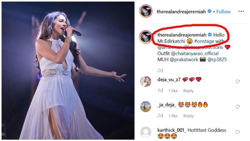 அந்த நடிகர் தான் பலரும் யூகித்திருந்த வேலையில் நடிகை ஆண்டிரியாவே ஒரு பதிவை தனது இன்ஸ்டாகிராம் பக்கத்தில் ஒரு புகைப்படத்தை பதிவு செய்து அதற்கு "Hello Mr.Edirkatchi.." என தலைப்பு வைத்துள்ளார். பொதுவாக பாடலை பாடிய புகைப்படத்தை மட்டுமே பகிரும் ஆண்ட்ரியா இப்போது என்ன பாடல் பாடினேன் என்றும் கூறியுள்ளார் என்று ஒரு தரப்பு ரசிகர்கள் கூறினாலும், "புரிந்து விட்டது" என சிரிப்பாய் சிரிக்கிறார்கள் விவரம் அறிந்தவர்கள்.