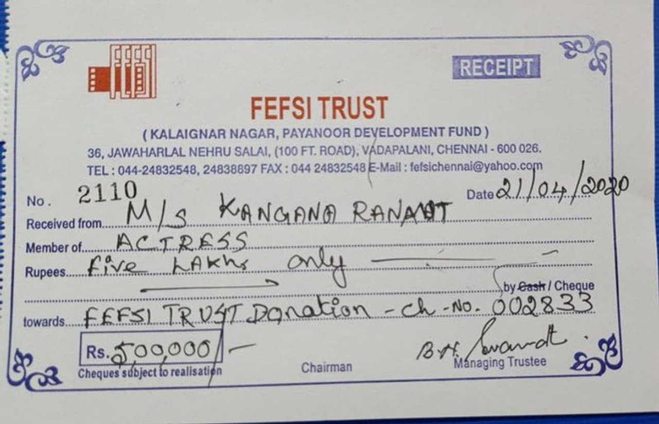 இந்நிலையில் ஏ.எல். விஜய் இயக்கத்தில் தலைவி படத்தில் நடித்து வரும் கங்கனா ரனாவத் பெப்சிக்கு நிதி உதவி அளித்துள்ளார்.